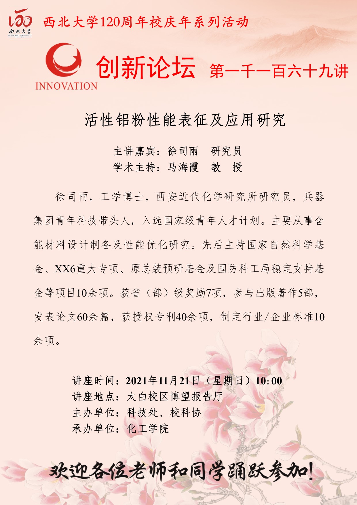 徐司雨 研究员 乐投平台创新论坛第一千一百六十九讲暨120周年校庆年系列活动:活性铝粉性能表征及应用研究 讲座时间 2021年11月21日(星期日)10:00 讲座地点 太白校区博望报告厅 讲座人介绍 徐司雨 研究员 讲座内容