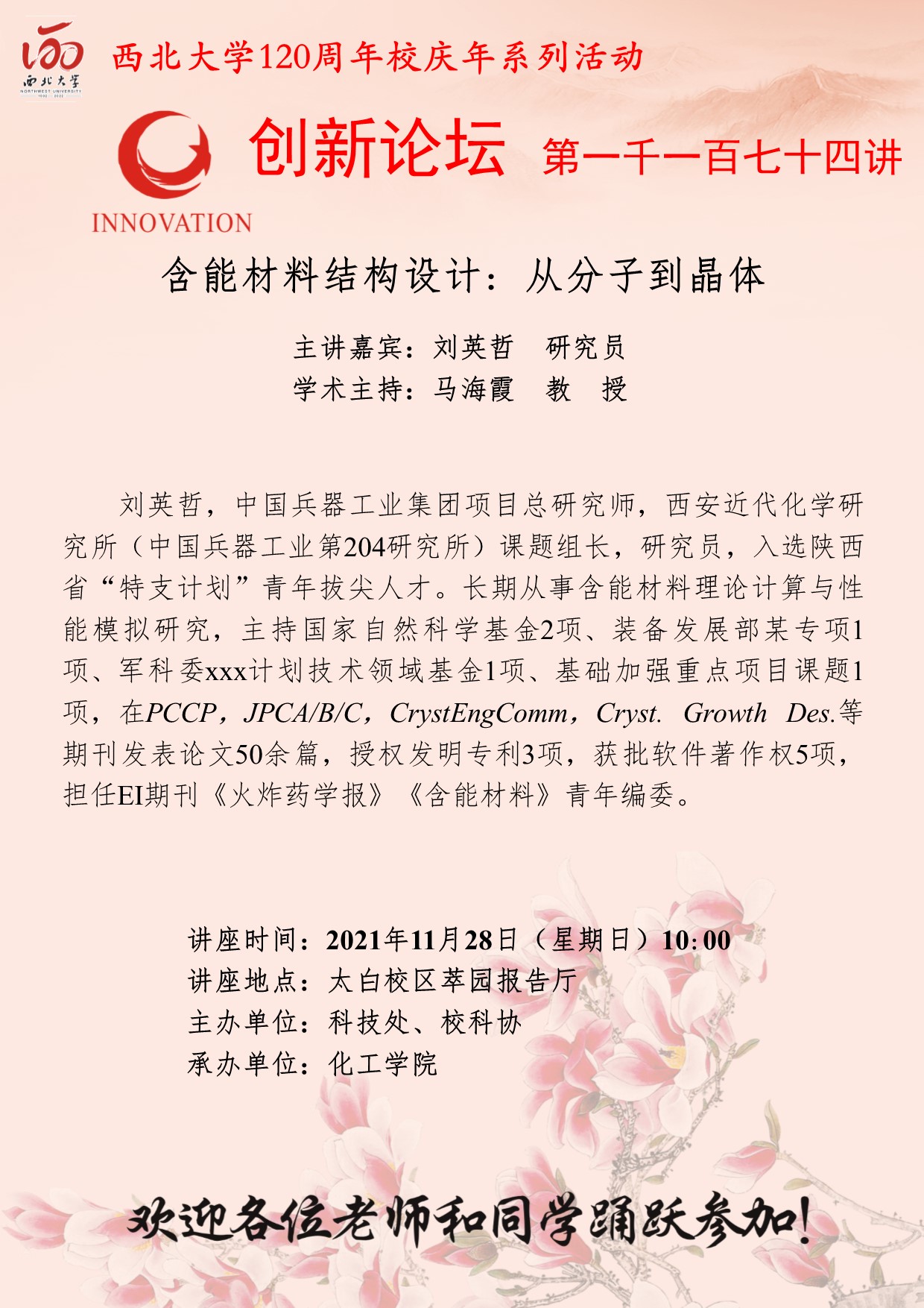 刘英哲 研究员 乐投平台创新论坛第一千一百七十四讲暨120周年校庆年系列活动:含能材料结构设计: 从分子到晶体 讲座时间 2021年11月28日(星期日)10:00 讲座地点 太白校区萃园报告厅 讲座人介绍 刘英哲 研究员 讲座内容
