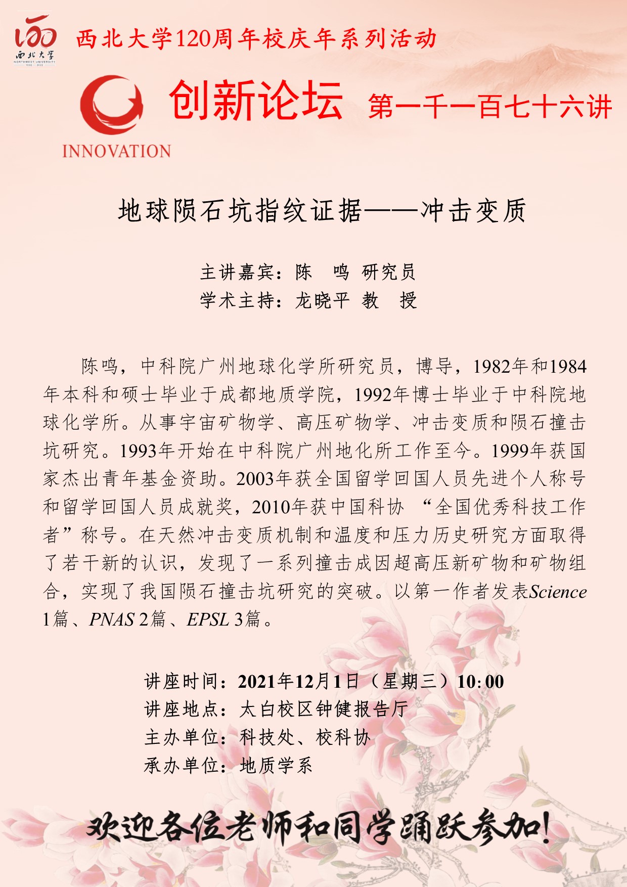 陈鸣 研究员 乐投平台创新论坛第一千一百七十六讲暨120周年校庆年系列活动:地球陨石坑指纹证据——冲击变质 讲座时间 2021年12月1日(星期三)10:00 讲座地点 太白校区钟健报告厅 讲座人介绍 陈鸣 研究员 讲座内容