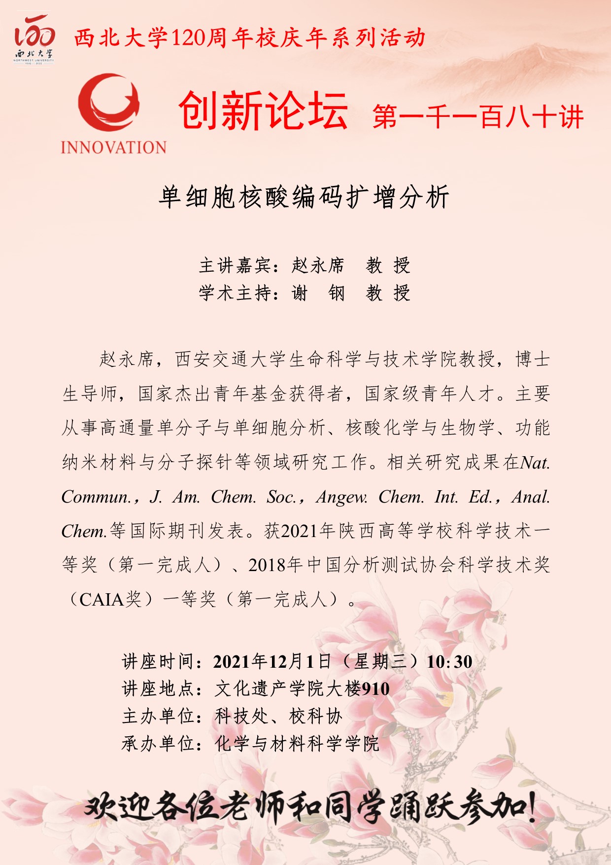赵永席 教授 乐投平台创新论坛第一千一百八十讲暨120周年校庆年系列活动:单细胞核酸编码扩增分析 讲座时间 2021年12月1日(星期三)10:30 讲座地点 文化遗产学院大楼910 讲座人介绍 赵永席 教授 讲座内容