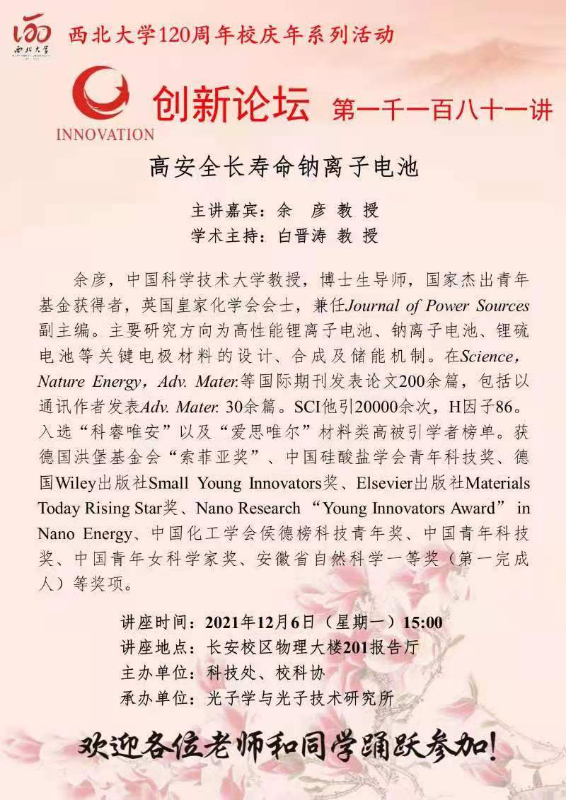余彦 教授 乐投平台创新论坛第一千一百八十一讲暨120周年校庆年系列活动:高安全长寿命钠离子电池 讲座时间 2021年12月6日(星期一)15:00 讲座地点 长安校区物理大楼201报告厅 讲座人介绍 余彦 教授 讲座内容