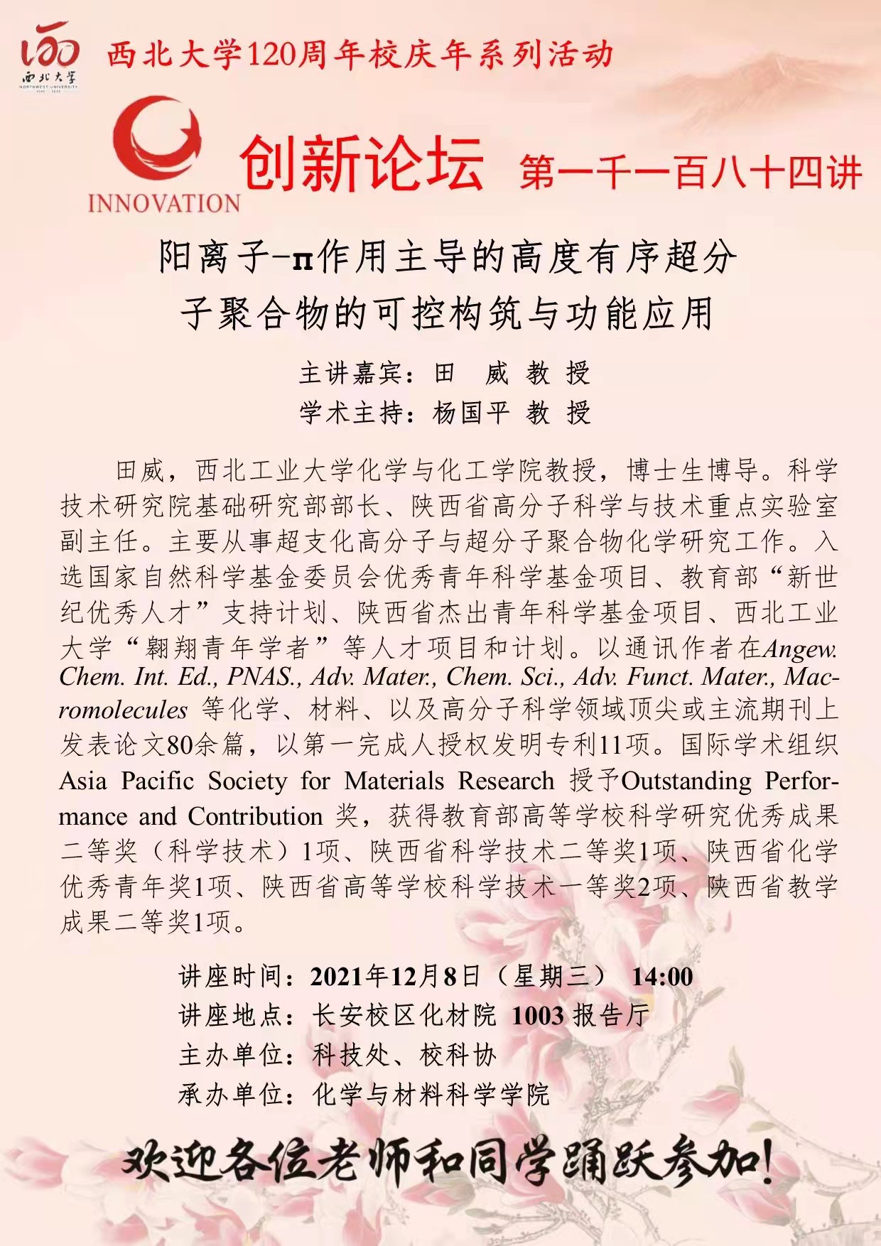 田威 教授 乐投平台创新论坛第一千一百八十四讲暨120周年校庆年系列活动:阳离子-π作用主导的高度有序超分子聚合物的可控构筑与功能应用 讲座时间 2021年12月8日(星期三) 14:00 讲座地点 长安校区化材院 1003 报告厅 讲座人介绍 田威 教授 讲座内容