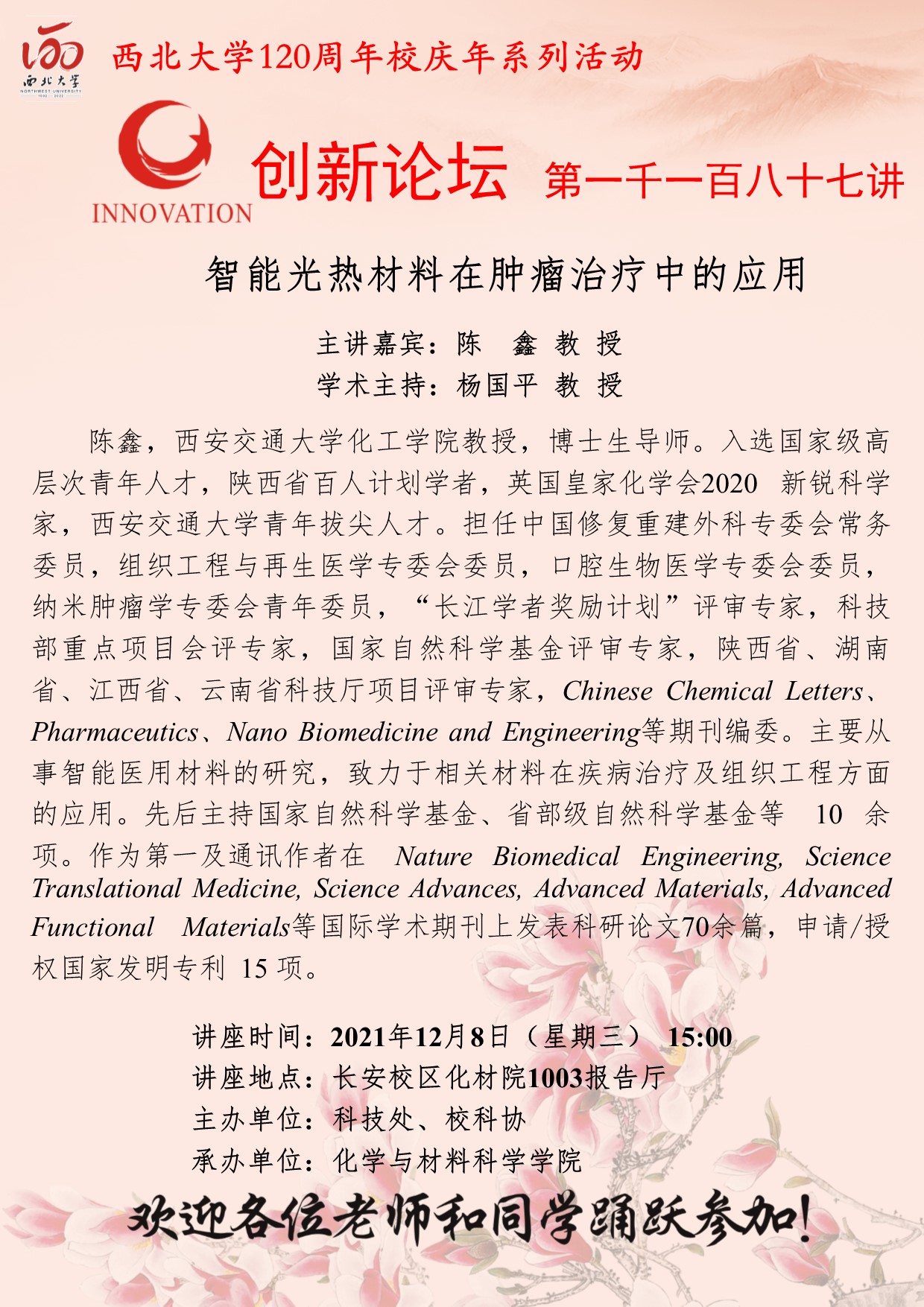 陈鑫 教授 乐投平台创新论坛第一千一百八十七讲暨120周年校庆年系列活动:智能光热材料在肿瘤治疗中的应用 讲座时间 2021年12月8日(星期三) 15:00 讲座地点 长安校区化材院1003报告厅 讲座人介绍 陈鑫 教授 讲座内容