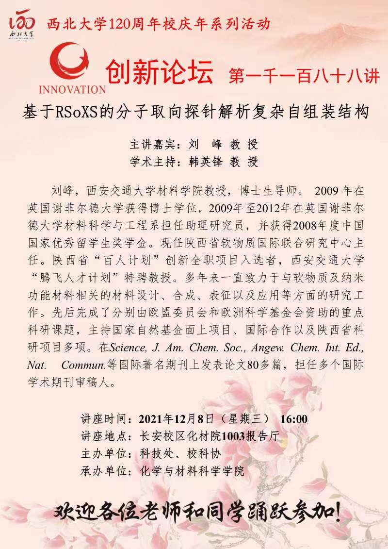 刘峰 教授 乐投平台创新论坛第一千一百八十八讲暨120周年校庆年系列活动:基于RSoXS的分子取向探针解析复杂自组装结构 讲座时间 2021年12月8日(星期三) 16:00 讲座地点 长安校区化材院1003报告厅 讲座人介绍 刘峰 教授 讲座内容