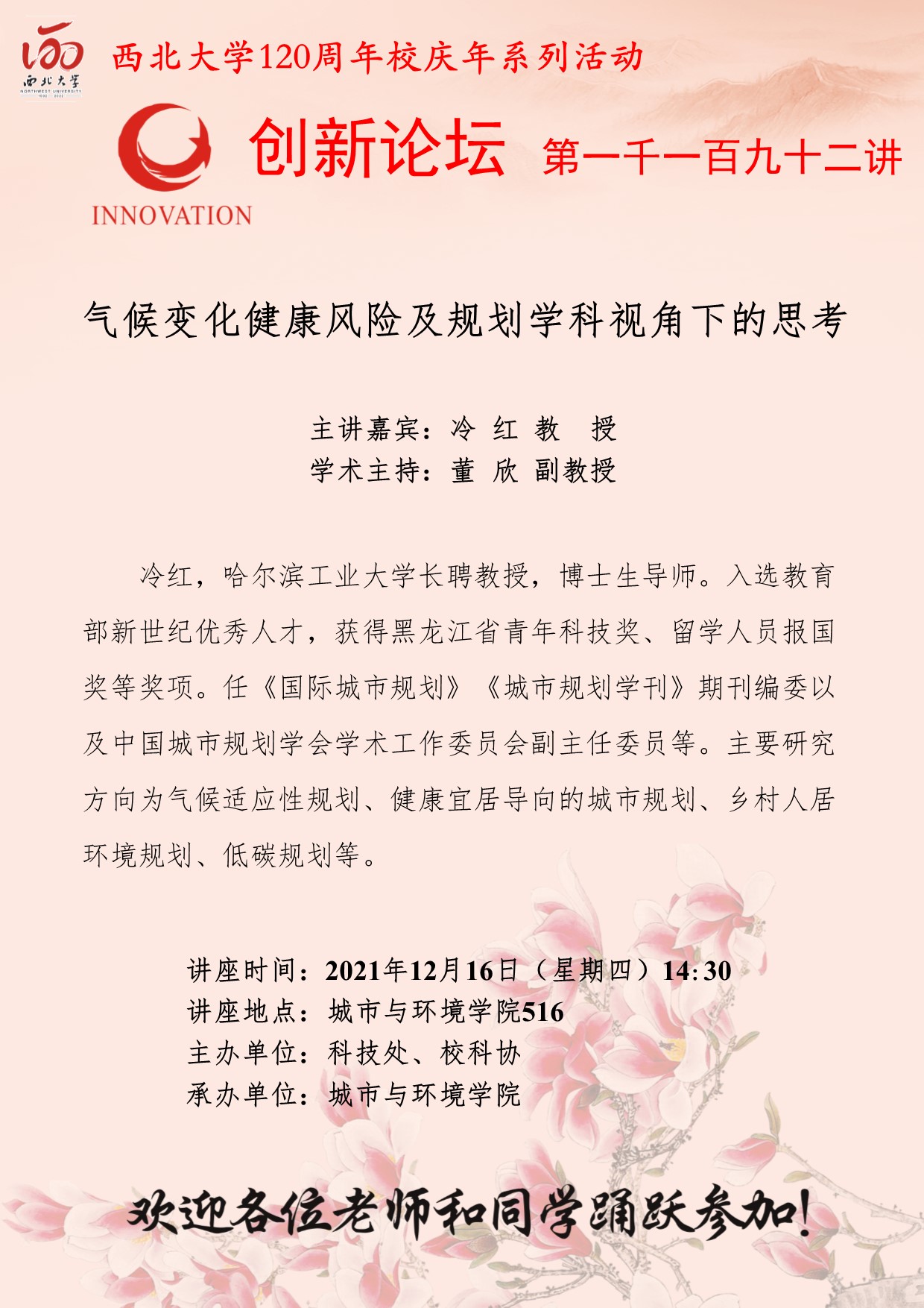 冷红 教授 乐投平台创新论坛第一千一百九十二讲暨120周年校庆年系列活动:气候变化健康风险及规划学科视角下的思考 讲座时间 2021年12月16日(星期四)14:30 讲座地点 城市与环境学院516 讲座人介绍 冷红 教授 讲座内容