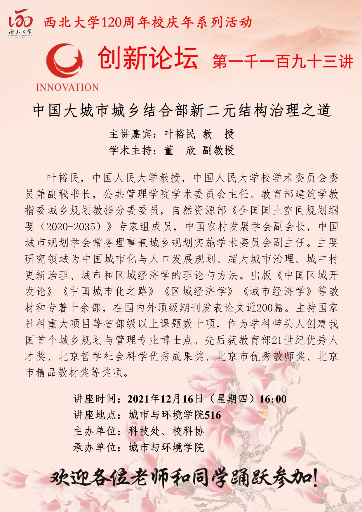 叶裕民 教授 乐投平台创新论坛第一千一百九十三讲暨120周年校庆年系列活动:中国大城市城乡结合部新二元结构治理之道 讲座时间 2021年12月16日(星期四)16:00 讲座地点 城市与环境学院516 讲座人介绍 叶裕民 教授 讲座内容