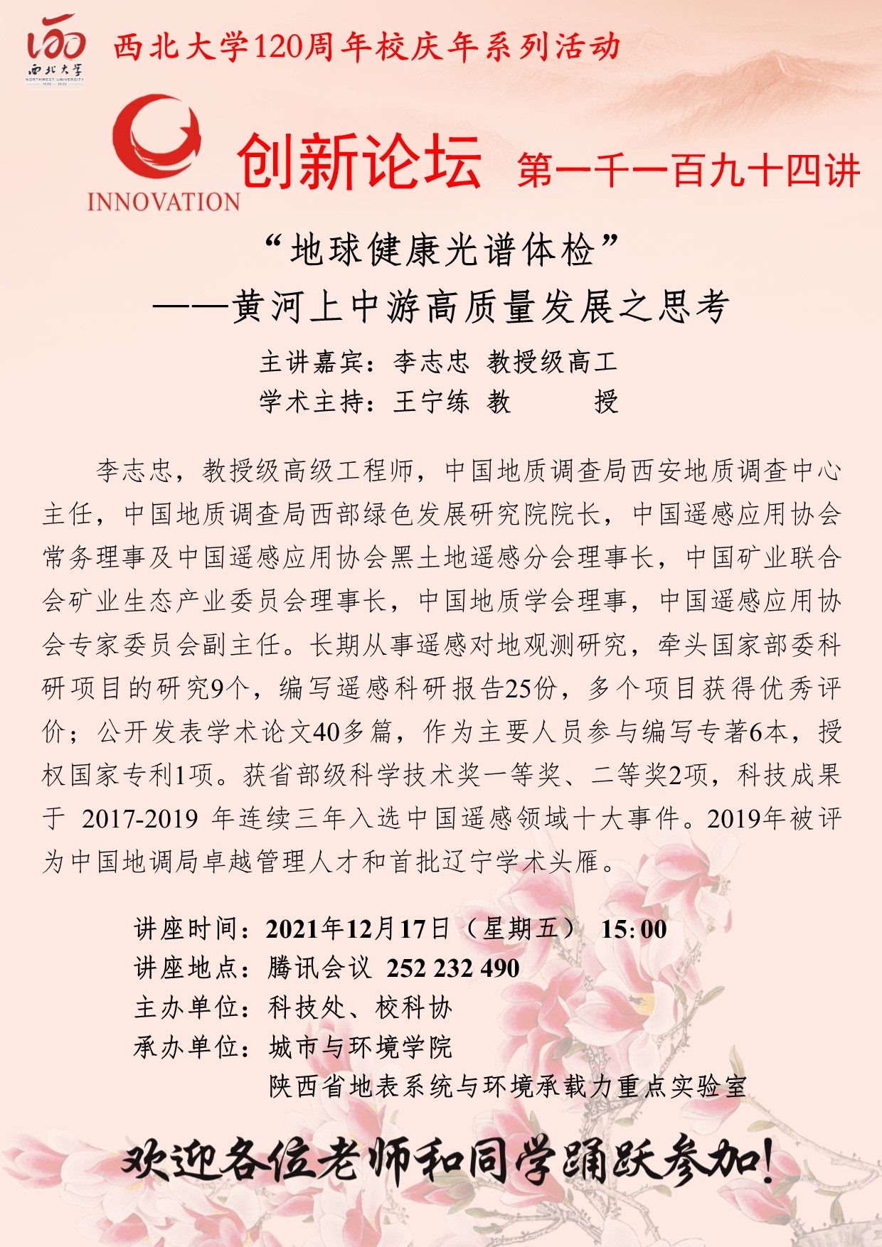 李志忠 教授级高工 乐投平台创新论坛第一千一百九十四讲暨120周年校庆年系列活动:“地球健康光谱体检”——黄河上中游高质量发展之思考 讲座时间 2021年12月17日(星期五) 15:00 讲座地点 腾讯会议 252232490 讲座人介绍 李志忠 教授级高工 讲座内容