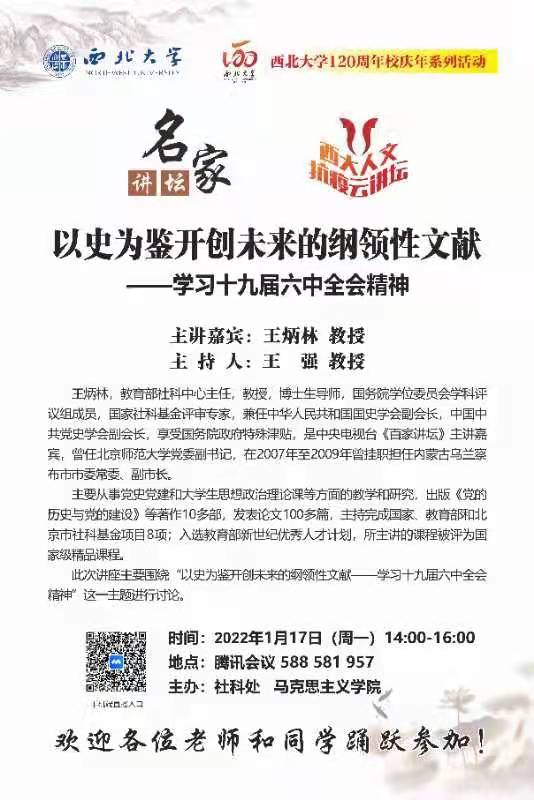 王炳林 教授 乐投平台西大人文抗疫云讲坛:以史为鉴开创未来的纲领性文献——学习十九届六中全会精神 讲座时间 2022年1月17日(周一)14:00-16:00 讲座地点 腾讯会议:588581957 讲座人介绍 王炳林 教授 讲座内容