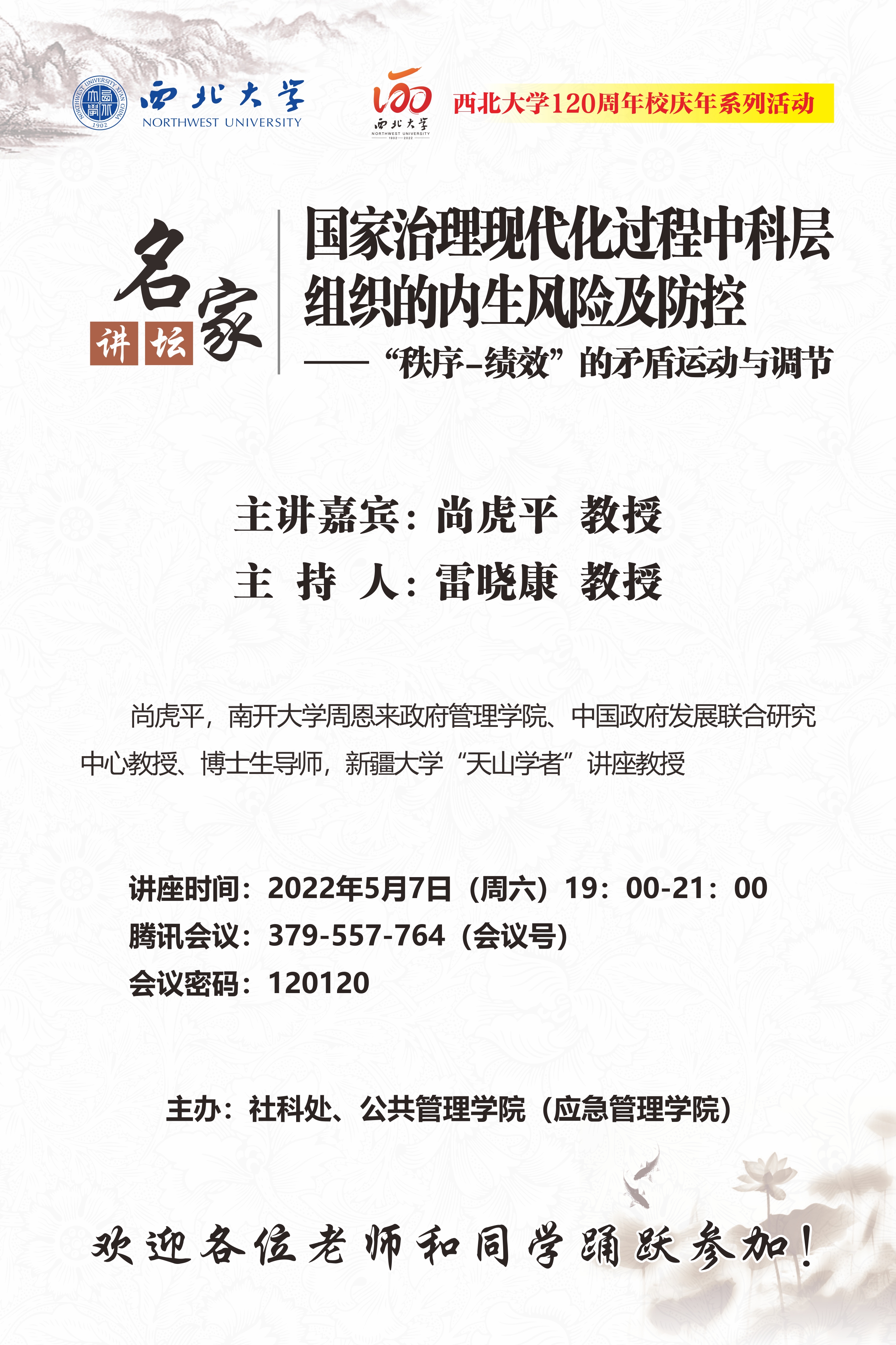 尚虎平 教授 乐投平台120周年校庆年系列活动:国家治理现代化过程中科层组织的内生风险及防控 讲座时间 2022年5月7日(周六)19:00-21:00 讲座地点 腾讯会议:379557764 讲座人介绍 尚虎平 教授 讲座内容