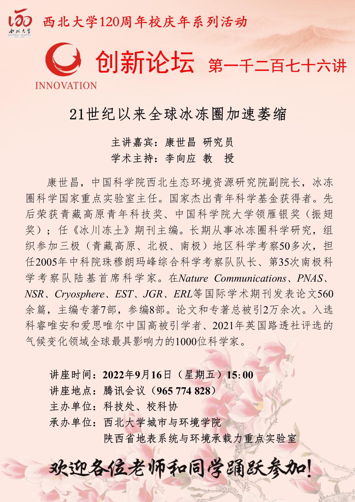 康世昌 研究员 乐投平台创新论坛第一千二百七十六讲暨120周年校庆年系列活动:21世纪以来全球冰冻圈加速萎缩 讲座时间 2022年9月16日(星期五)15:00 讲座地点 腾讯会议(965 774 828) 讲座人介绍 康世昌 研究员 讲座内容