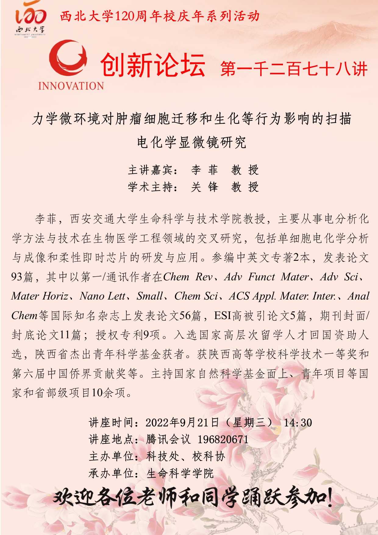 李 菲 教 授 乐投平台创新论坛第一千二百七十八讲暨120周年校庆年系列活动:力学微环境对肿瘤细胞迁移和生化等行为影响的扫描电化学显微镜研究 讲座时间 2022年9月21日(星期三) 14:30 讲座地点 腾讯会议 196820671 讲座人介绍 李 菲 教 授 讲座内容