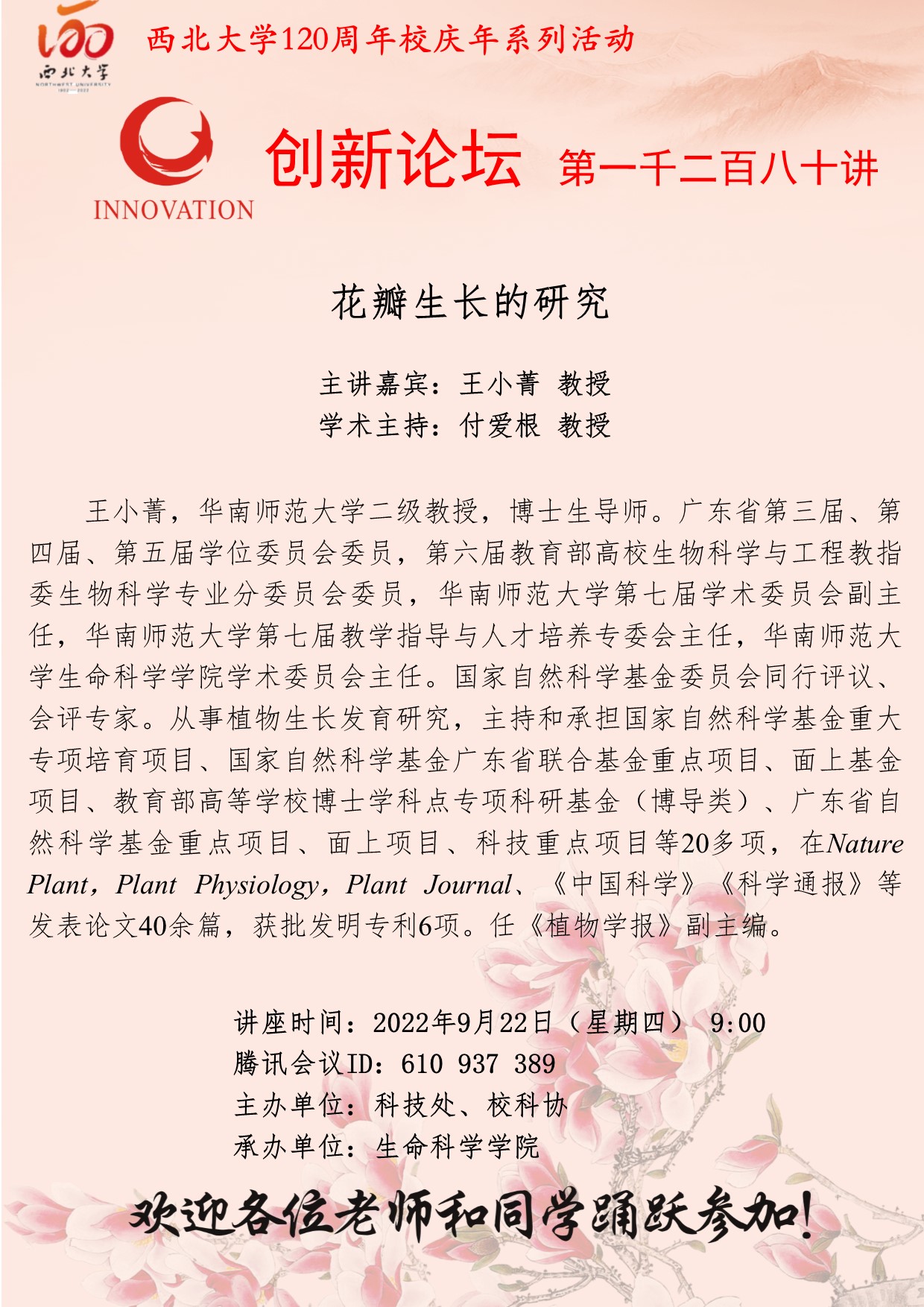 王小菁 教授 乐投平台创新论坛第一千二百八十讲暨120周年校庆年系列活动:花瓣生长的研究 讲座时间 2022年9月22日(星期四) 9:00 讲座地点 腾讯会议ID:610 937 389 讲座人介绍 王小菁 教授 讲座内容