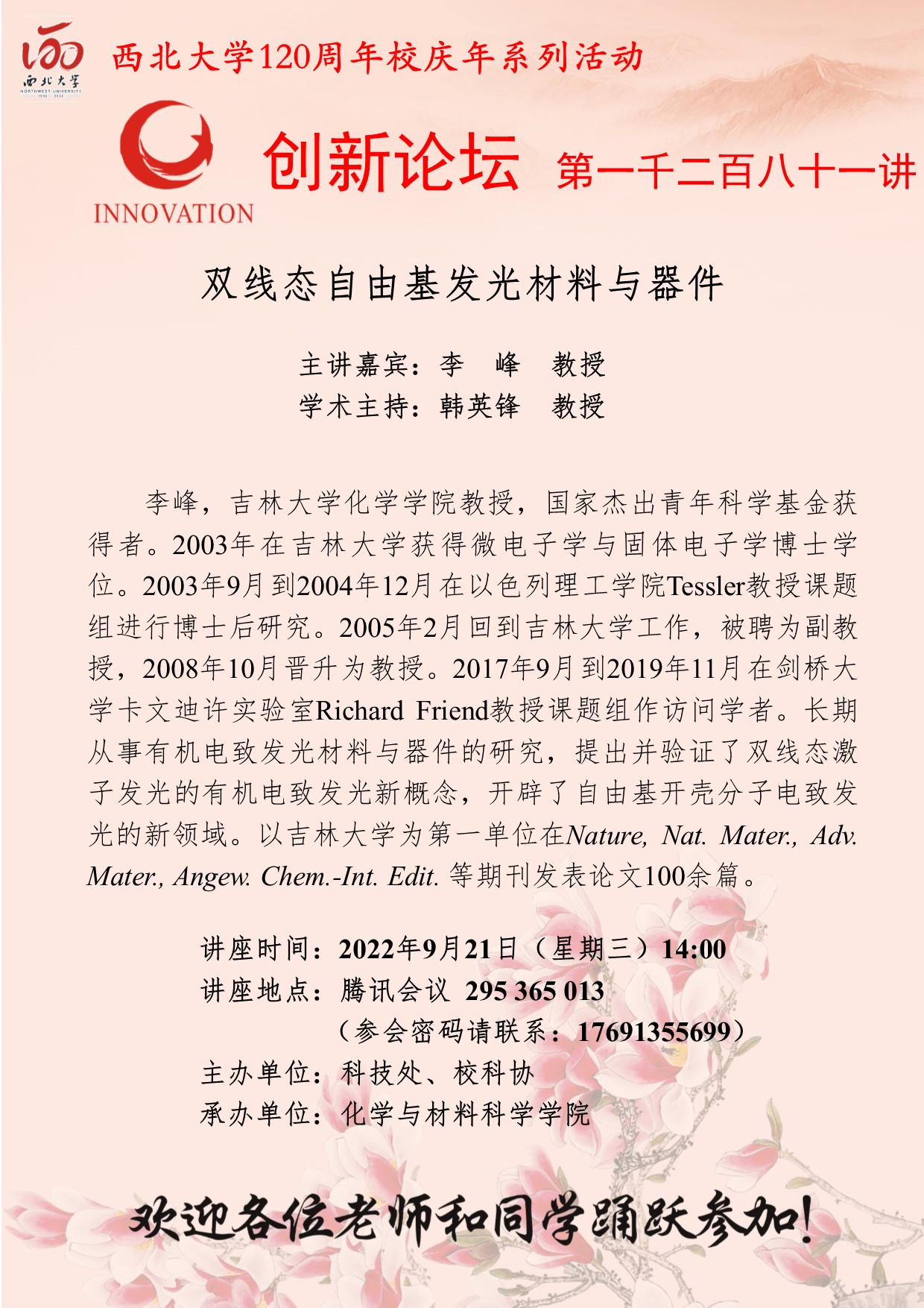 李峰 教授 乐投平台创新论坛第一千二百八十一讲暨120周年校庆年系列活动: 双线态自由基发光材料与器件 讲座时间 2022年9月21日(星期三) 14:00 讲座地点 腾讯会议ID:295 365 013 (参会密码请联系:17691355699) 讲座人介绍 李峰 教授 讲座内容