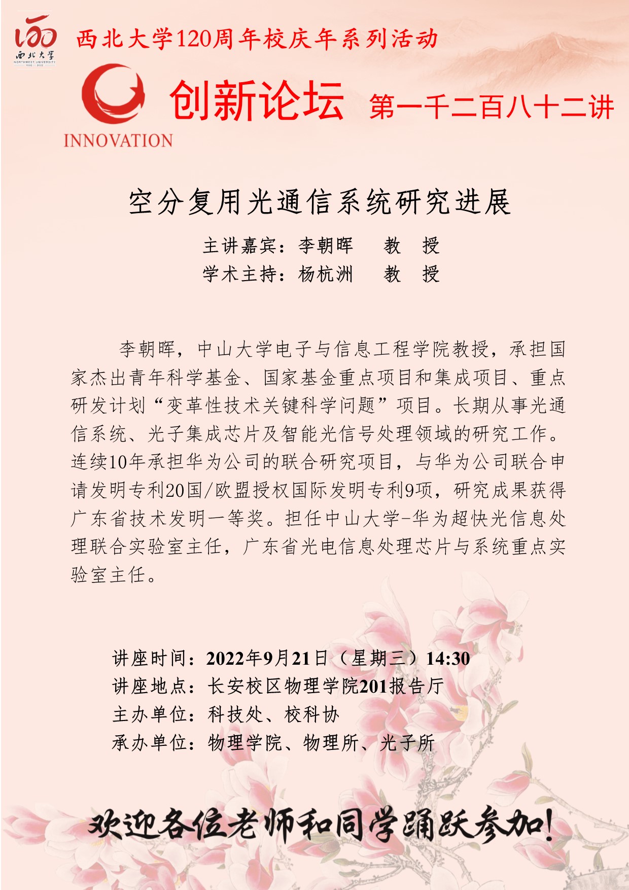 李朝晖 教授 乐投平台创新论坛第一千二百八十二讲暨120周年校庆年系列活动::空分复用光通信系统研究进展 讲座时间 2022年9月21日(星期三) 14:30 讲座地点 物理学院201报告厅 讲座人介绍 李朝晖 教授 讲座内容