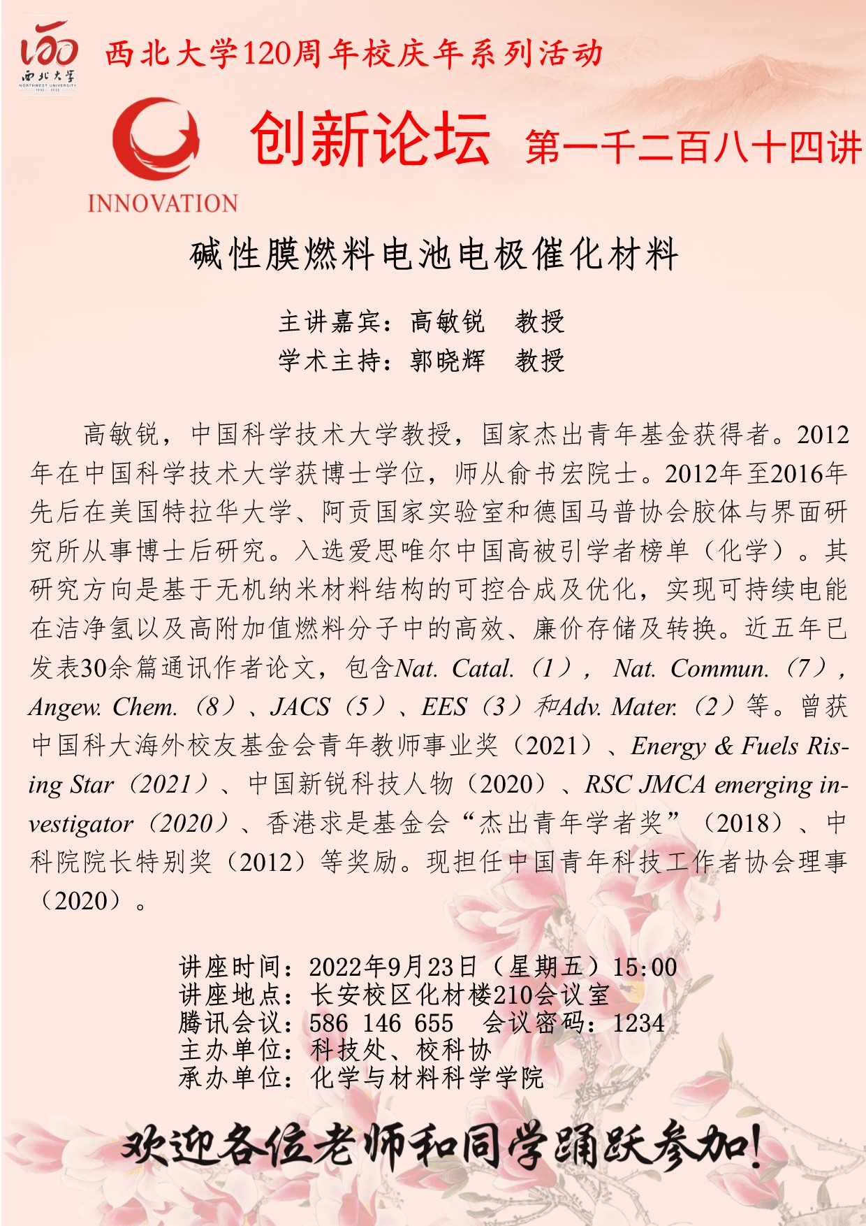 高敏锐 教授 乐投平台创新论坛第一千二百八十四讲暨120周年校庆年系列活动:碱性膜燃料电池电极催化材料 讲座时间 2022年9月21日(星期五) 15:00 讲座地点 长安校区化材楼210会议室 (腾讯会议:586 146 655 会议密码:1234) 讲座人介绍 高敏锐 教授 讲座内容