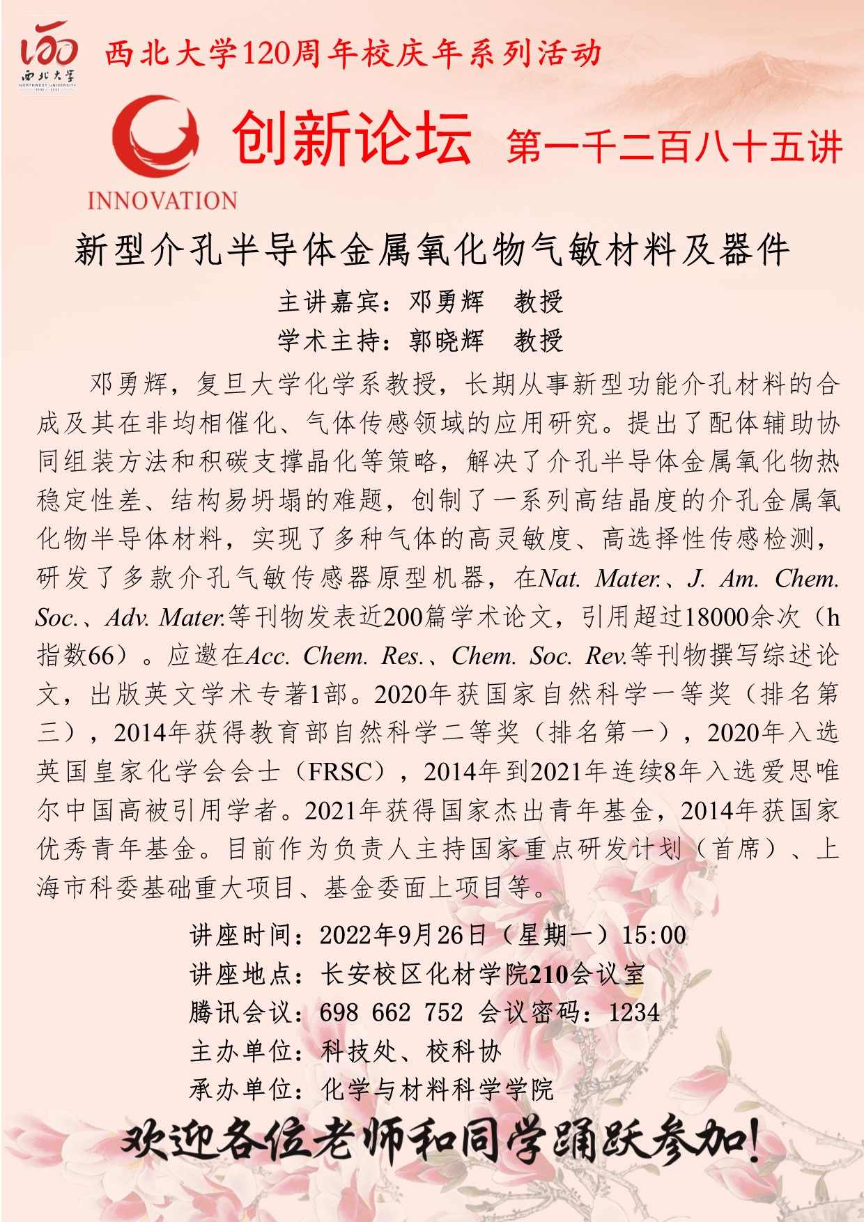 邓勇辉 教授 乐投平台创新论坛第一千二百八十五讲暨120周年校庆年系列活动::新型介孔半导体金属氧化物气敏材料及器件 讲座时间 2022年9月26日(星期一) 15:00 讲座地点 长安校区化材院210会议室(腾讯会议:698 662 752,会议密码:1234) 讲座人介绍 邓勇辉 教授 讲座内容