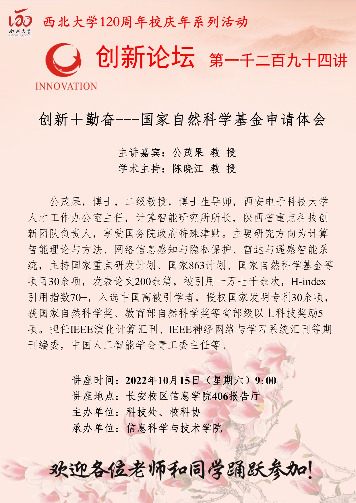 公茂果 教授 乐投平台创新论坛第一千二百九十四讲暨120周年校庆年系列活动: 创新+勤奋——国家自然科学基金申请体会 讲座时间 2022年10月15日(星期六)9:00 讲座地点 长安校区信息学院406报告厅 讲座人介绍 公茂果 教授 讲座内容