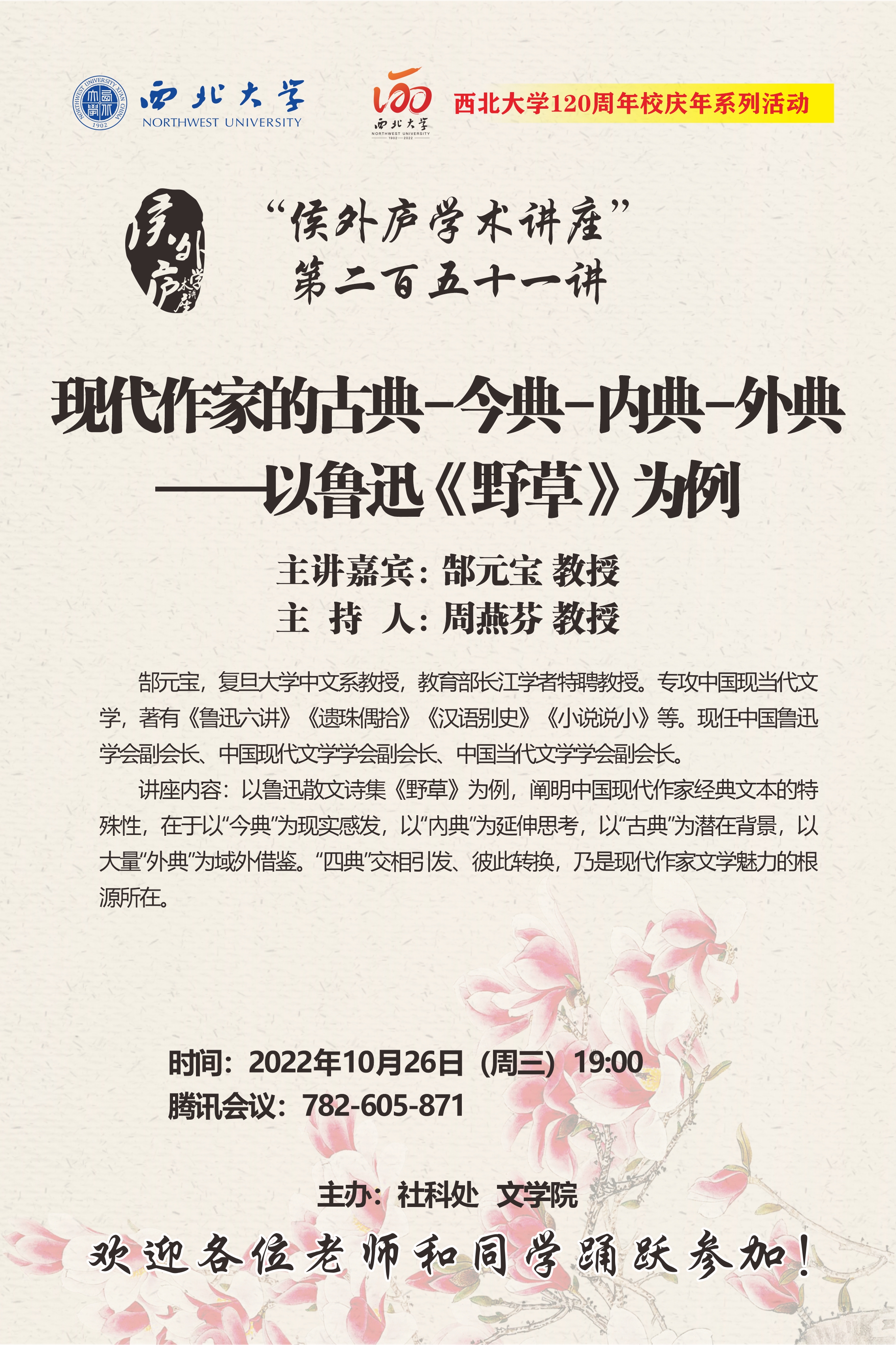 郜元宝 教授 侯外庐学术讲座第二百五十一讲暨120周年校庆年系列活动:现代作家的古典—今典-内典-外典——以鲁迅《野草》为例 讲座时间 2022年10月26日(周三)19:00 讲座地点 腾讯会议:782605871 讲座人介绍 郜元宝 教授 讲座内容