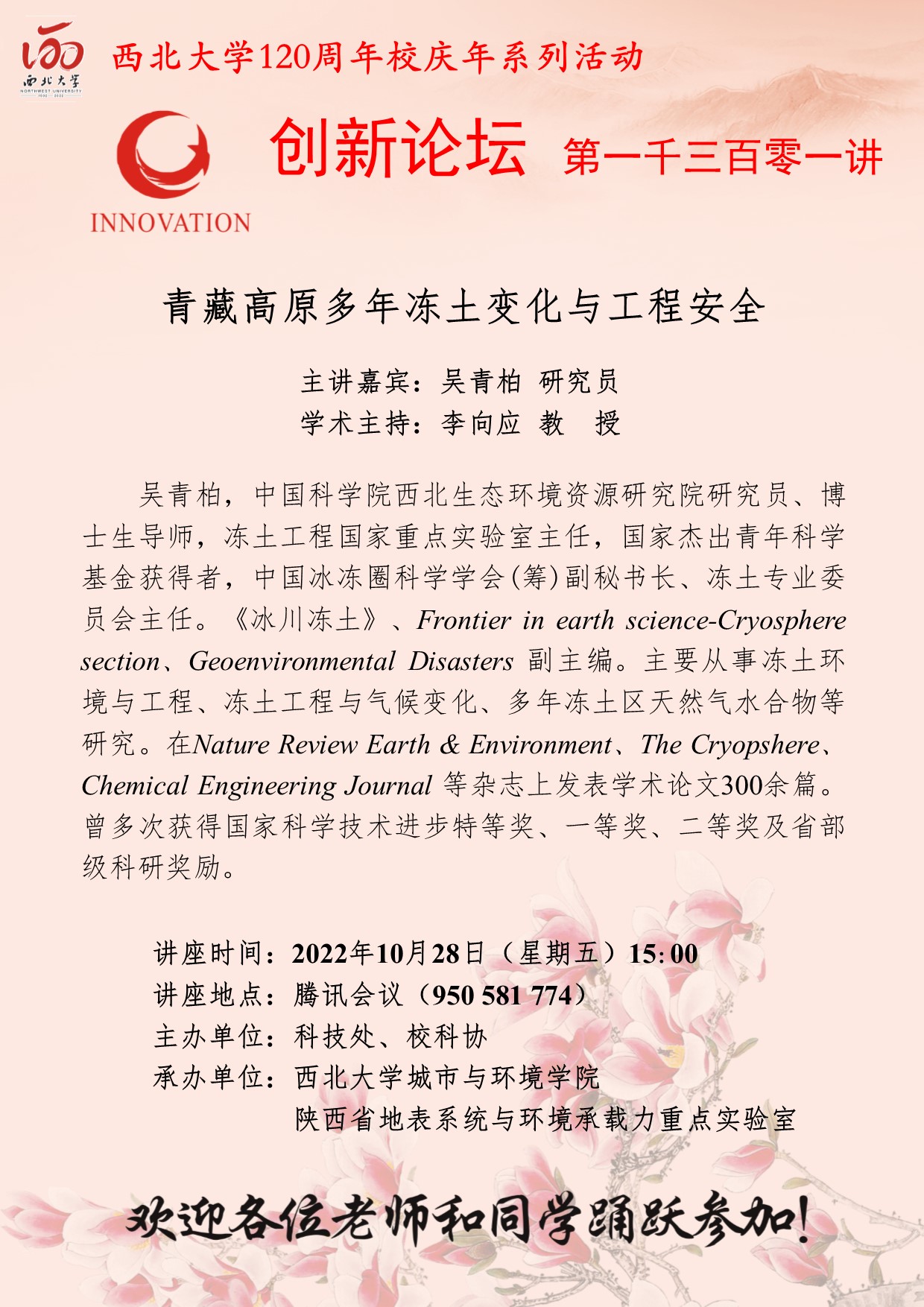 吴青柏 研究员 乐投平台创新论坛第一千三百零一讲暨120周年校庆年系列活动: 青藏高原多年冻土变化与工程安全 讲座时间 2022年10月28日(星期五)15:00 讲座地点 腾讯会议 950 581 774 讲座人介绍 吴青柏 研究员 讲座内容
