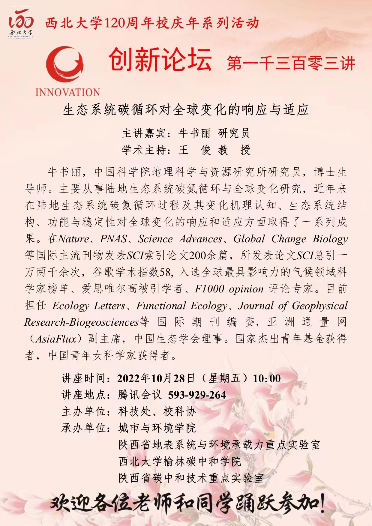 牛书丽 研究员 乐投平台创新论坛第一千三百零三讲暨120周年校庆年系列活动: 生态系统碳循环对全球变化的响应与适应 讲座时间 2022年10月28日(星期五) 10:00 讲座地点 腾讯会议 593-929-264 讲座人介绍 牛书丽 研究员 讲座内容