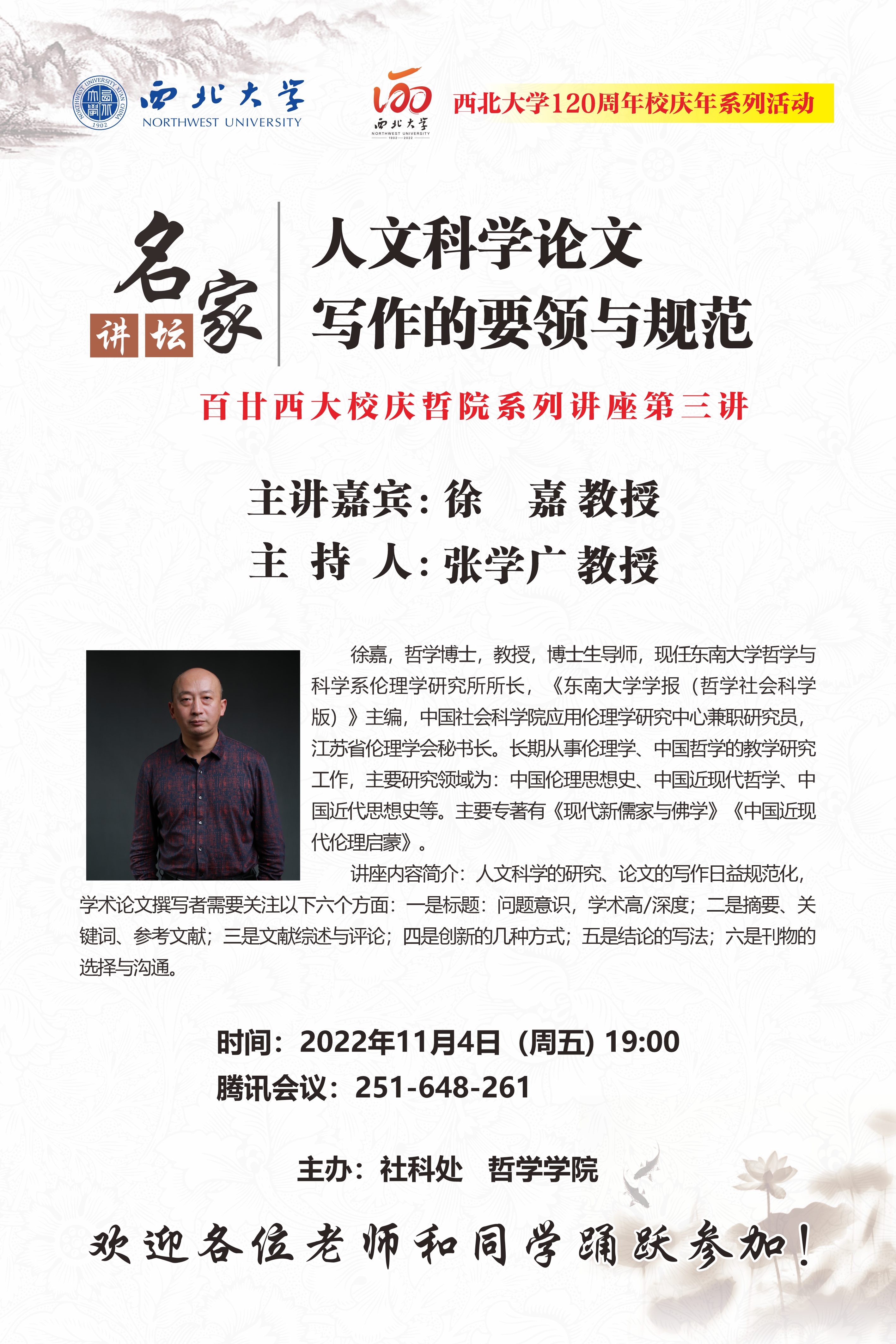 徐嘉 教授 乐投平台120周年校庆年系列活动:人文科学论文写作的要领与规范 讲座时间 2022年11月4日(周五)19:00 讲座地点 腾讯会议:251-648-261 讲座人介绍 徐嘉 教授 讲座内容