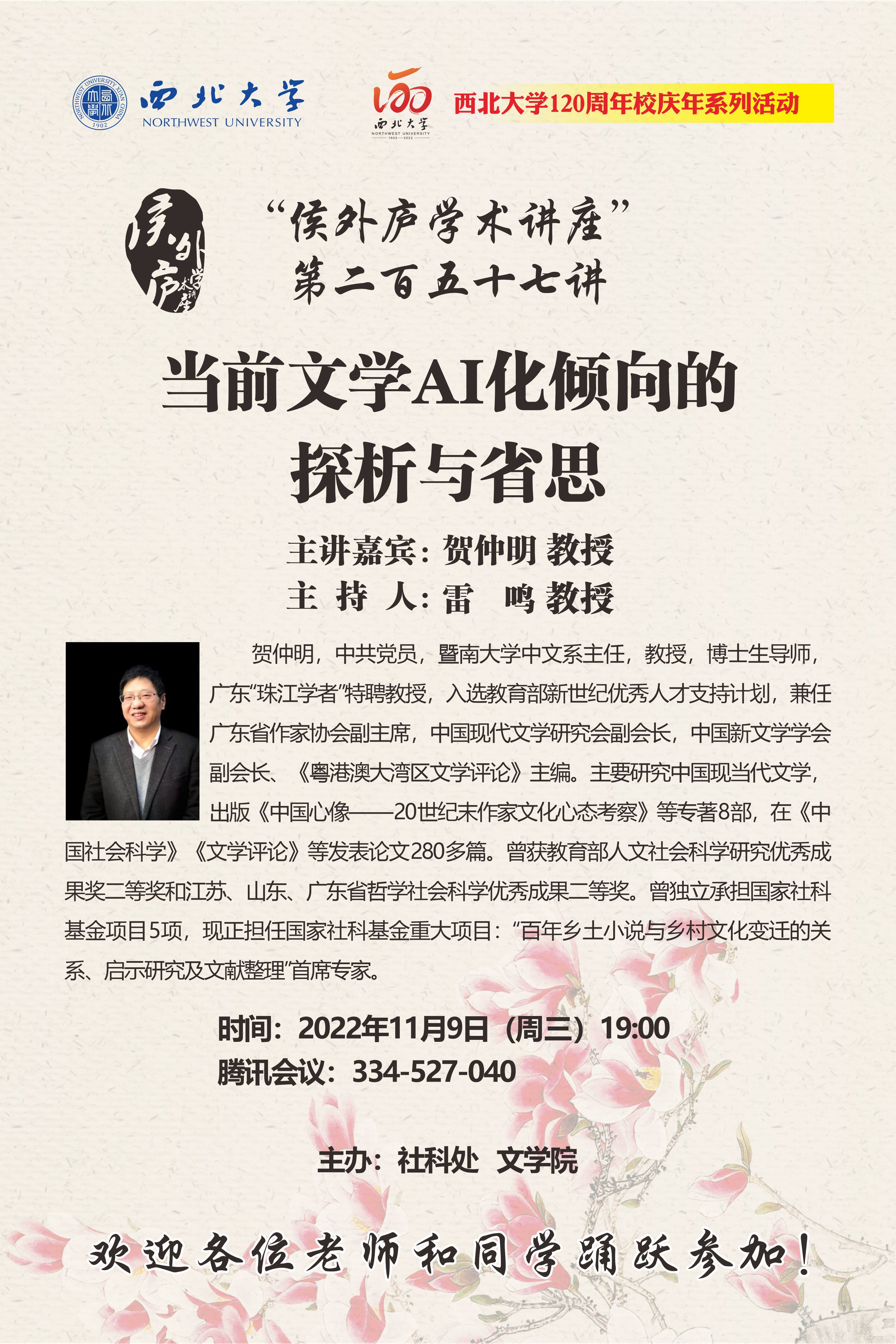 贺仲明 教授 侯外庐学术讲座第二百五十七讲暨120周年校庆年系列活动:当前文学AI化倾向的探析与省思 讲座时间 2022年11月9日(周三)19:00 讲座地点 腾讯会议:334-527-040 讲座人介绍 贺仲明 教授 讲座内容