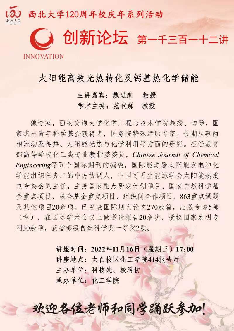 魏进家 教授 乐投平台创新论坛第一千三百一十二讲暨120周年校庆年系列活动:太阳能高效光热转化及钙基热化学储能 讲座时间 2022年11月16日(星期三)17:00 讲座地点 太白校区化工学院414报告厅 讲座人介绍 魏进家 教授 讲座内容