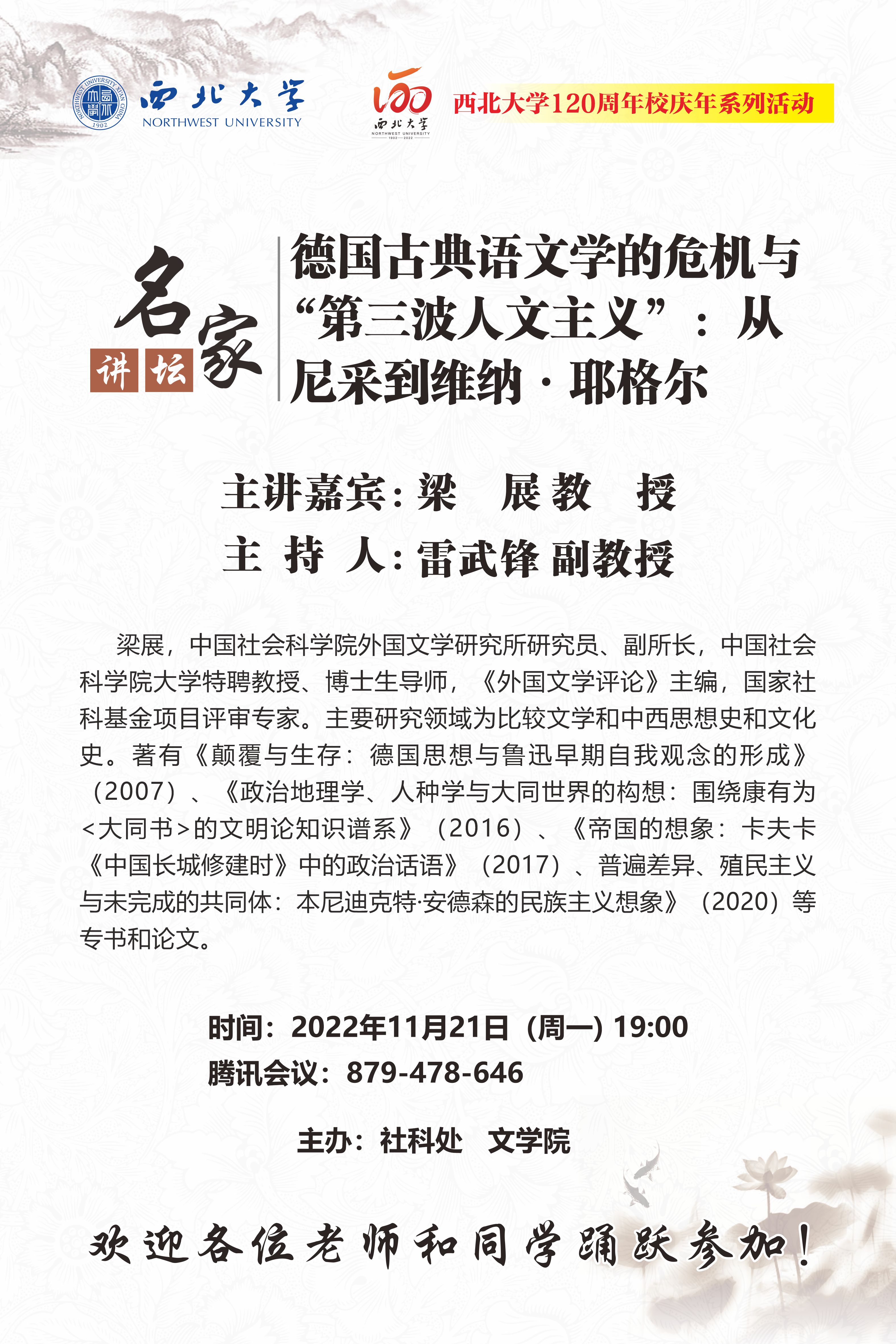 梁展 教授 乐投平台120周年校庆年系列活动:德国古典语文学的危机与“第三波人文主义”:从尼采到维纳·耶格尔 讲座时间 2022年11月21日(周一)19:00 讲座地点 腾讯会议:879-478-646 讲座人介绍 梁展 教授 讲座内容
