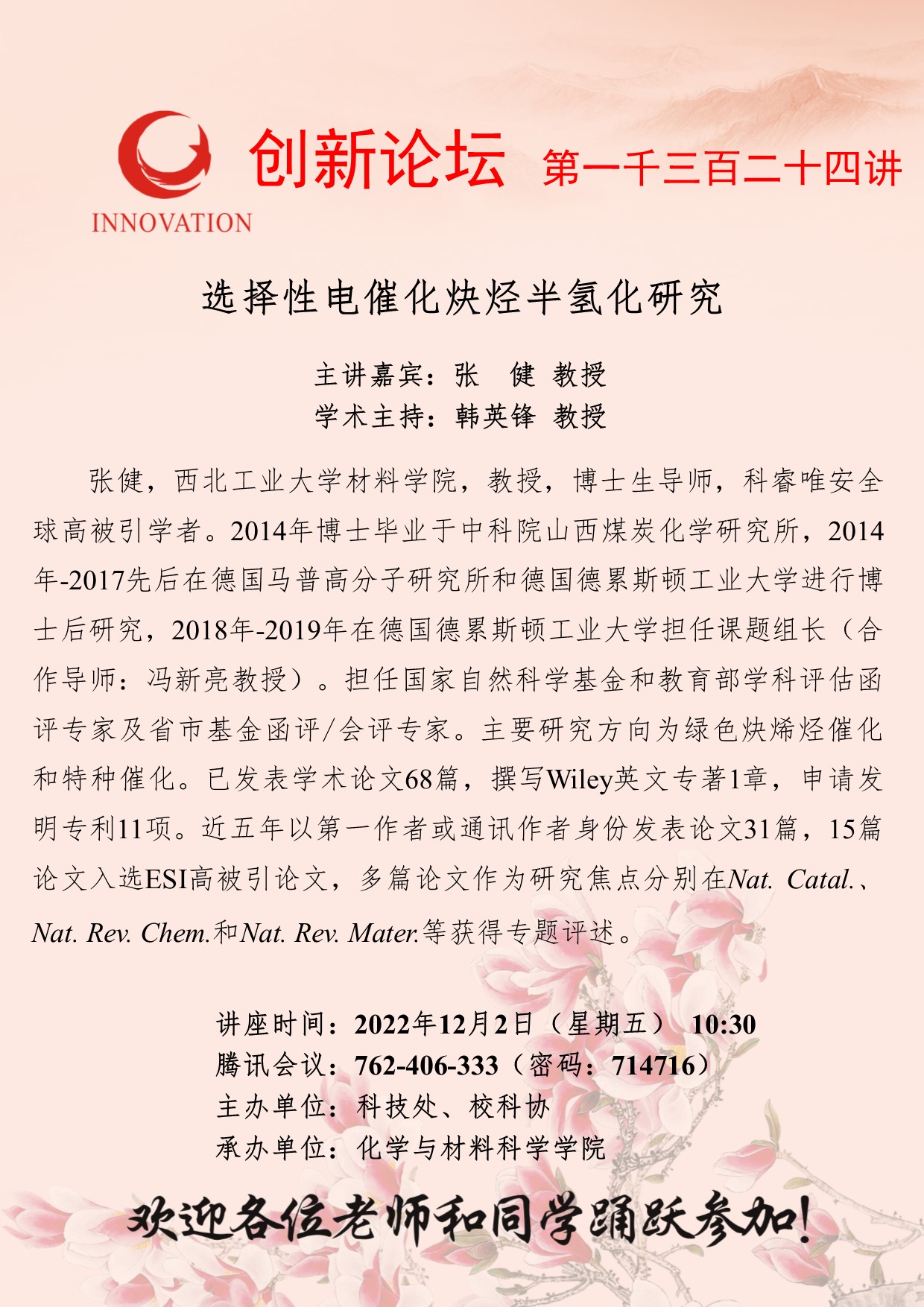 张 健 教授 乐投平台创新论坛第一千三百二十四讲:选择性电催化炔烃半氢化研究 讲座时间 2022年12月2日(星期五) 10:30 讲座地点 腾讯会议762-406-333(密码:714716) 讲座人介绍 张 健 教授 讲座内容