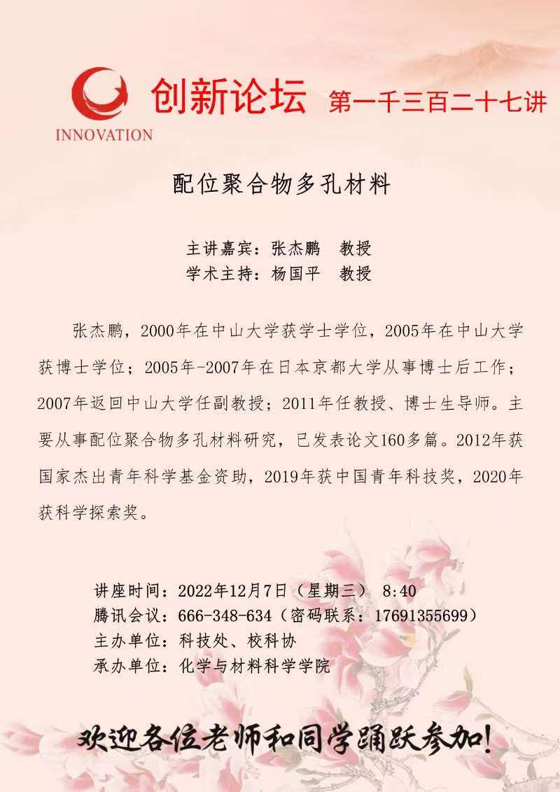 乐投平台创新论坛第一千三百二十七讲:配位聚合物多孔材料