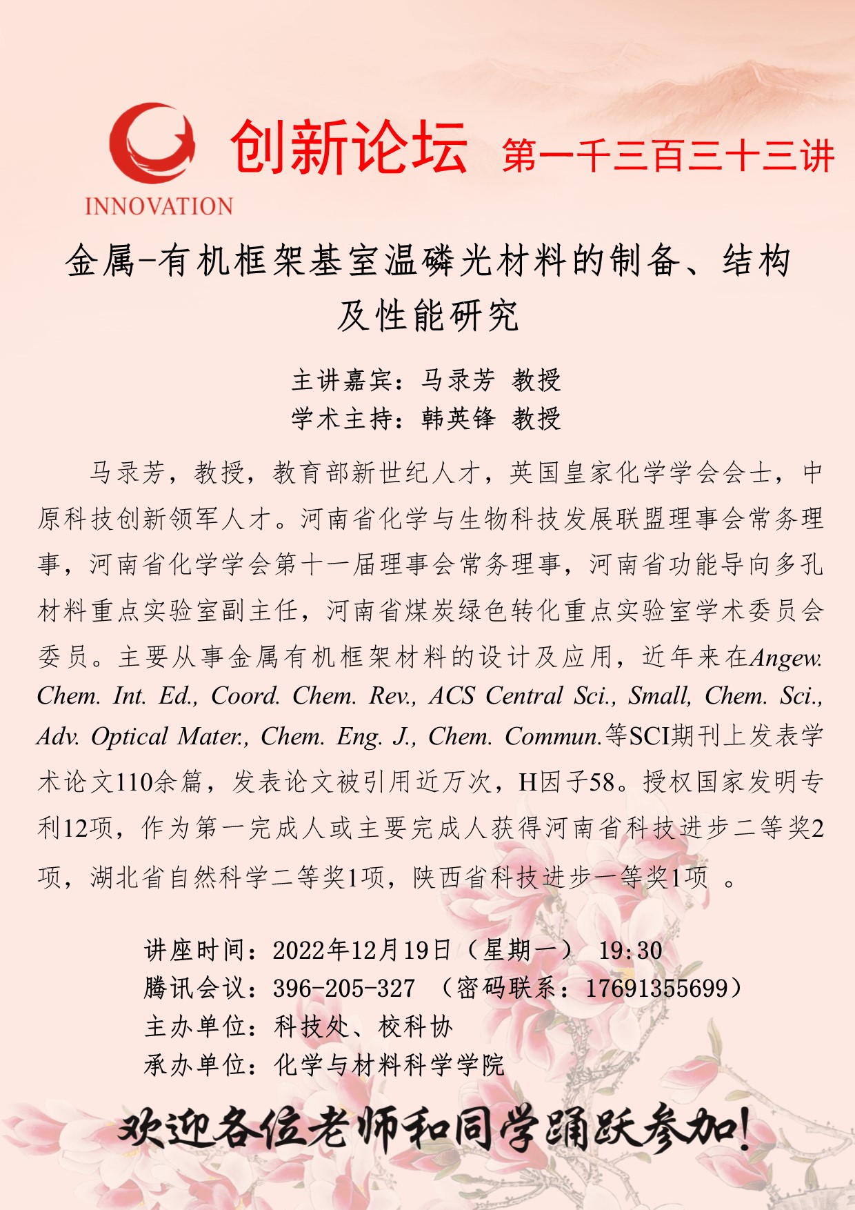 马录芳 教授 乐投平台创新论坛第一千三百三十三讲:金属-有机框架基室温磷光材料的制备、结构及性能研究 讲座时间 2022年12月19日(星期一) 19:30 讲座地点 腾讯会议:396-205-327 讲座人介绍 马录芳 教授 讲座内容