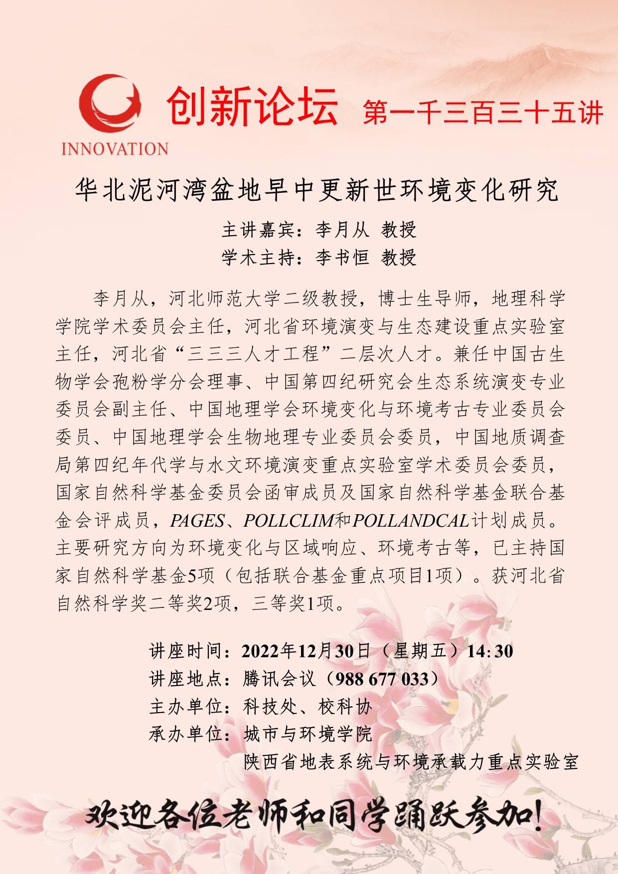 李月从 教授 乐投平台创新论坛第一千三百三十五讲:华北泥河湾盆地早中更新世环境变化研究 讲座时间 2022年12月30日(星期五)14:30 讲座地点 腾讯会议(988 677 033) 讲座人介绍 李月从 教授 讲座内容