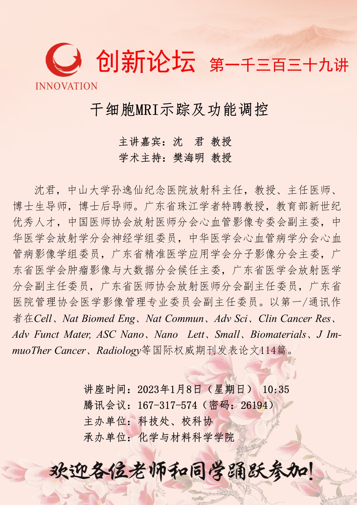 沈君 教授 乐投平台创新论坛第一千三百三十九讲:干细胞MRI示踪及功能调控 讲座时间 2023年1月8日(星期日) 10:35 讲座地点 腾讯会议:167-317-574 讲座人介绍 沈君 教授 讲座内容
