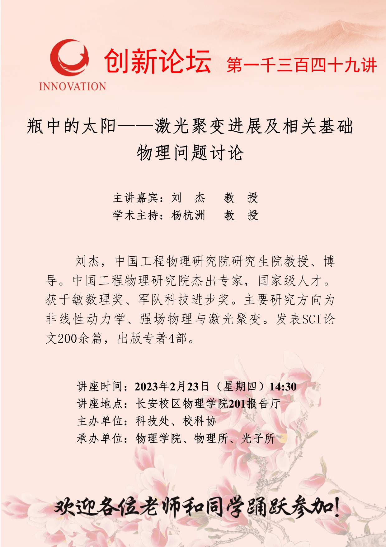 刘杰 教授 乐投平台创新论坛第一千三百四十九讲:瓶中的太阳——激光聚变进展及相关基础物理问题讨论 讲座时间 2023年2月23日(星期四)14:30 讲座地点 长安校区物理学院201报告厅 讲座人介绍 刘杰 教授 讲座内容