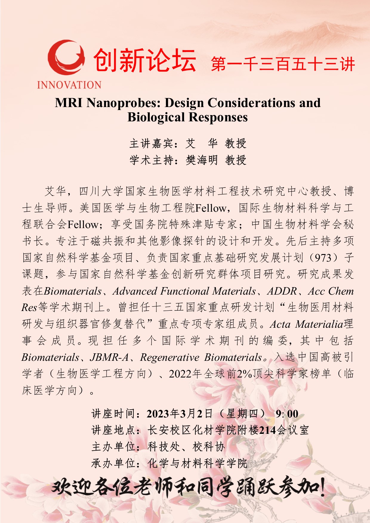 艾华 教授 乐投平台创新论坛第一千三百五十三讲:MRI Nanoprobes: Design Considerations and Biological Responses 讲座时间 2023年3月2日(星期四) 9: 00 讲座地点 长安校区化材学院附楼214会议室 讲座人介绍 艾华 教授 讲座内容
