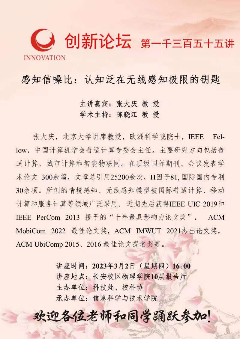 张大庆 教授 乐投平台创新论坛第一千三百五十五讲:感知信噪比:认知泛在无线感知极限的钥匙 讲座时间 2023年3月2日(星期四)16:00 讲座地点 长安校区物理学院10层报告厅 讲座人介绍 张大庆 教授 讲座内容