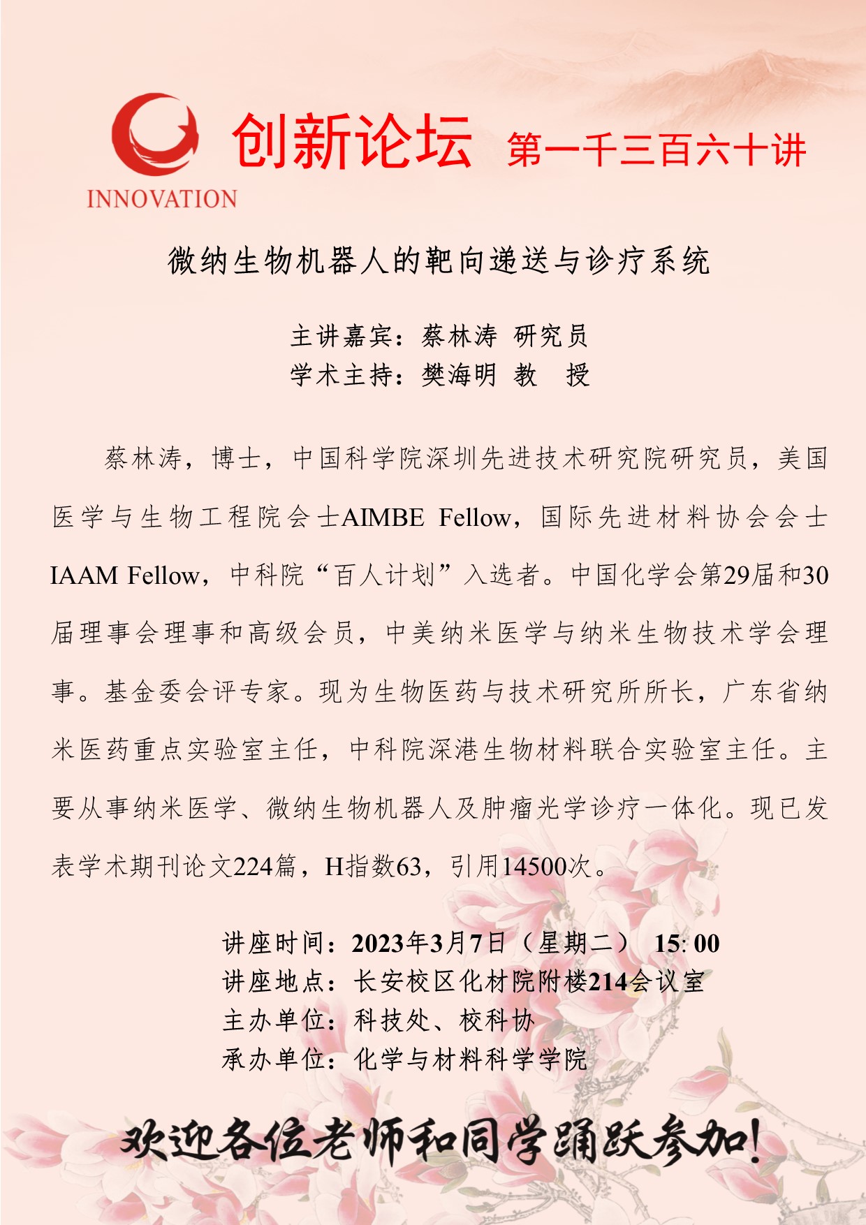 蔡林涛 研究员 乐投平台创新论坛第一千三百六十讲:微纳生物机器人的靶向递送与诊疗系统 讲座时间 2023年3月7日(星期二) 15: 00 讲座地点 长安校区化材院附楼214会议室 讲座人介绍 蔡林涛 研究员 讲座内容