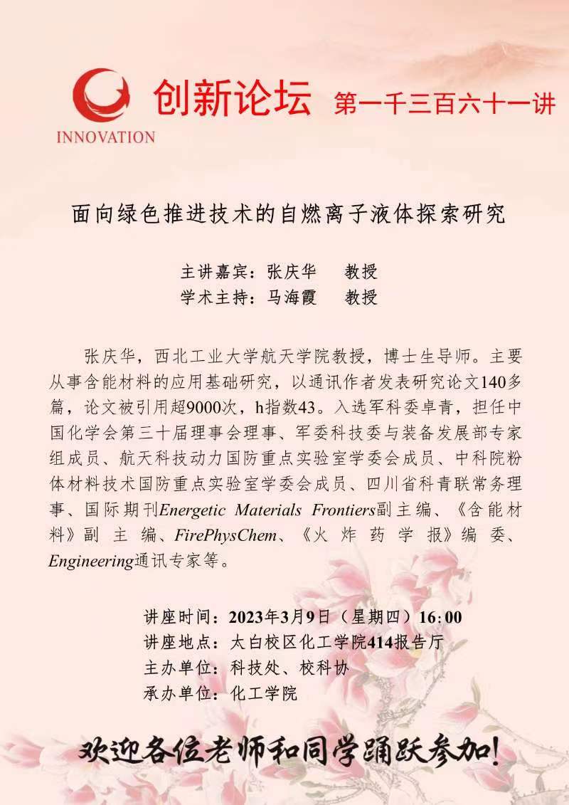 张庆华 教授 乐投平台创新论坛第一千三百六十一讲:面向绿色推进技术的自燃离子液体探索研究 讲座时间 2023年3月9日(星期四)16:00 讲座地点 太白校区化工学院414报告厅 讲座人介绍 张庆华 教授 讲座内容