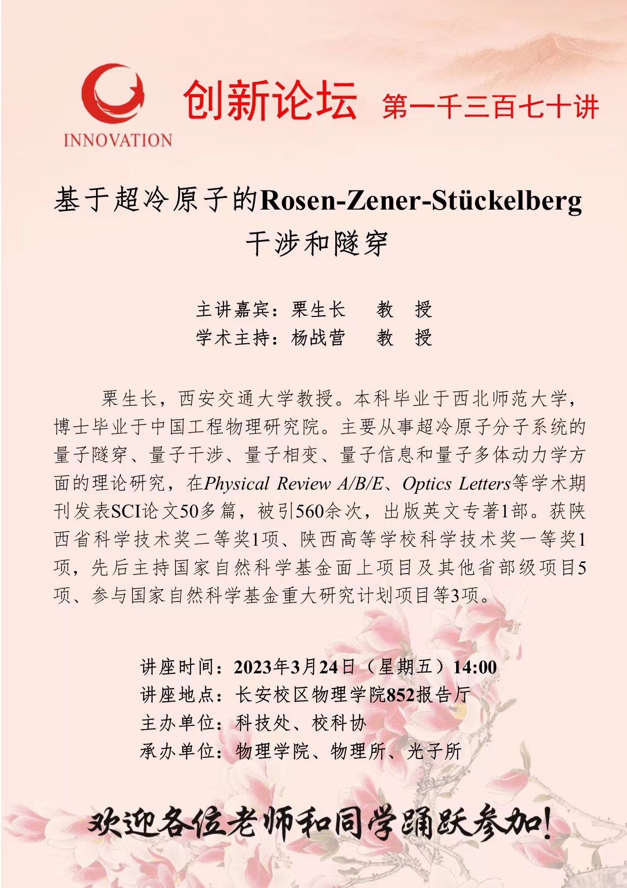 栗生长 教 授 乐投平台创新论坛第一千三百七十讲:基于超冷原子的Rosen-Zener-Stückelberg干涉和隧穿 讲座时间 2023年3月24日(星期五)14:00 讲座地点 长安校区物理学院852报告厅 讲座人介绍 栗生长 教 授 讲座内容