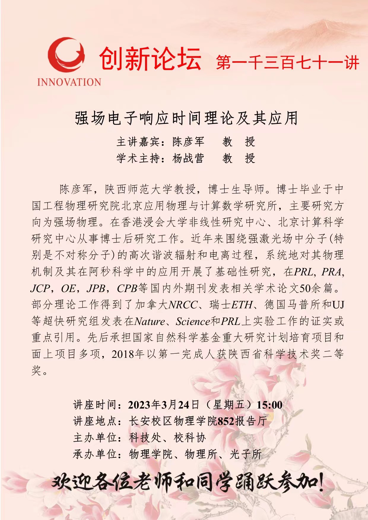 陈彦军 教 授 乐投平台创新论坛第一千三百七十一讲:强场电子响应时间理论及其应用 讲座时间 2023年3月24日(星期五)15:00 讲座地点 长安校区物理学院852报告厅 讲座人介绍 陈彦军 教 授 讲座内容