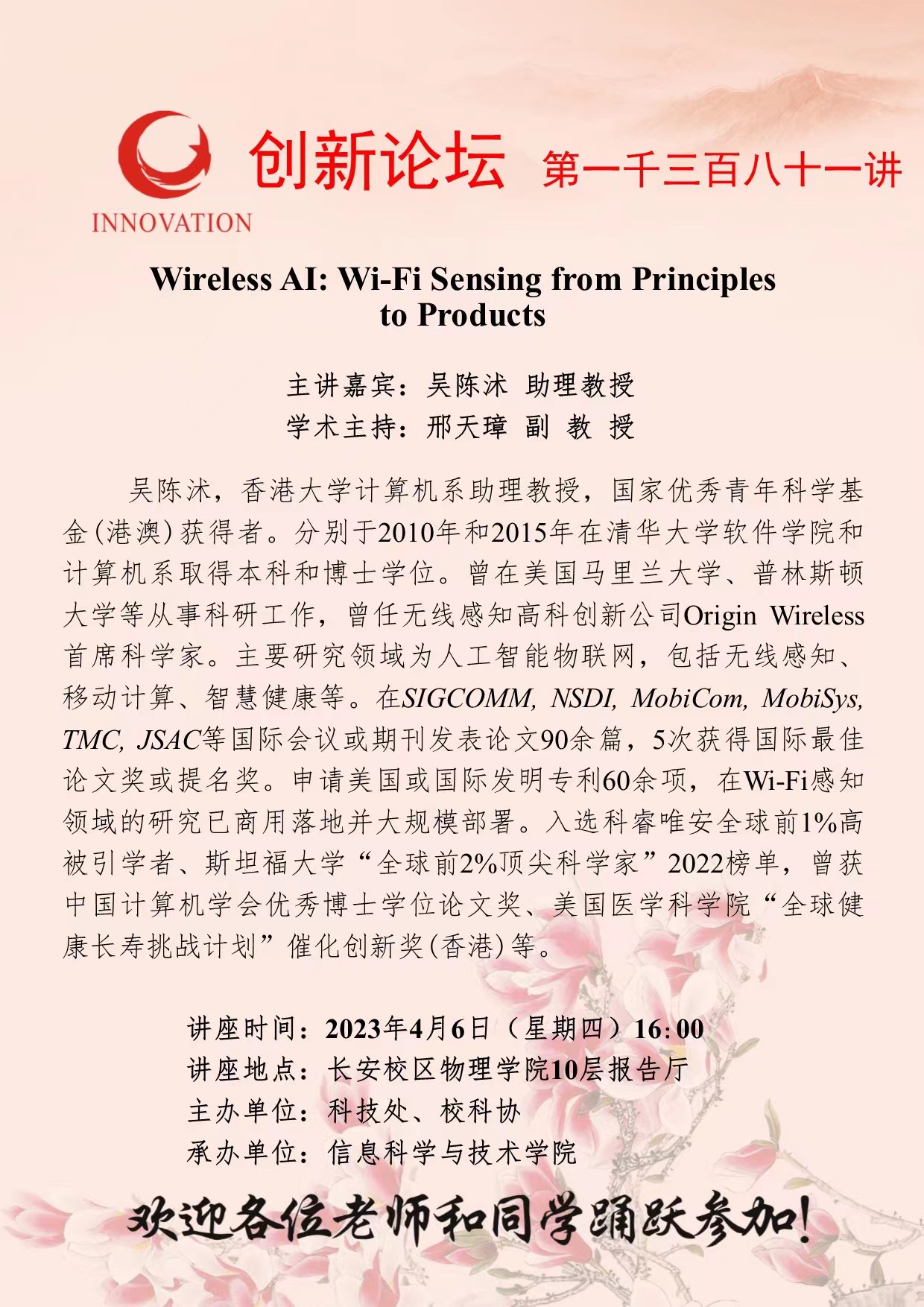 吴陈沭 助理教授 乐投平台创新论坛第一千三百八十一讲:Wireless AI: Wi-Fi Sensing from Principles to Products 讲座时间 2023年4月6日(星期四)16:00 讲座地点 长安校区物理学院10层报告厅 讲座人介绍 吴陈沭 助理教授 讲座内容
