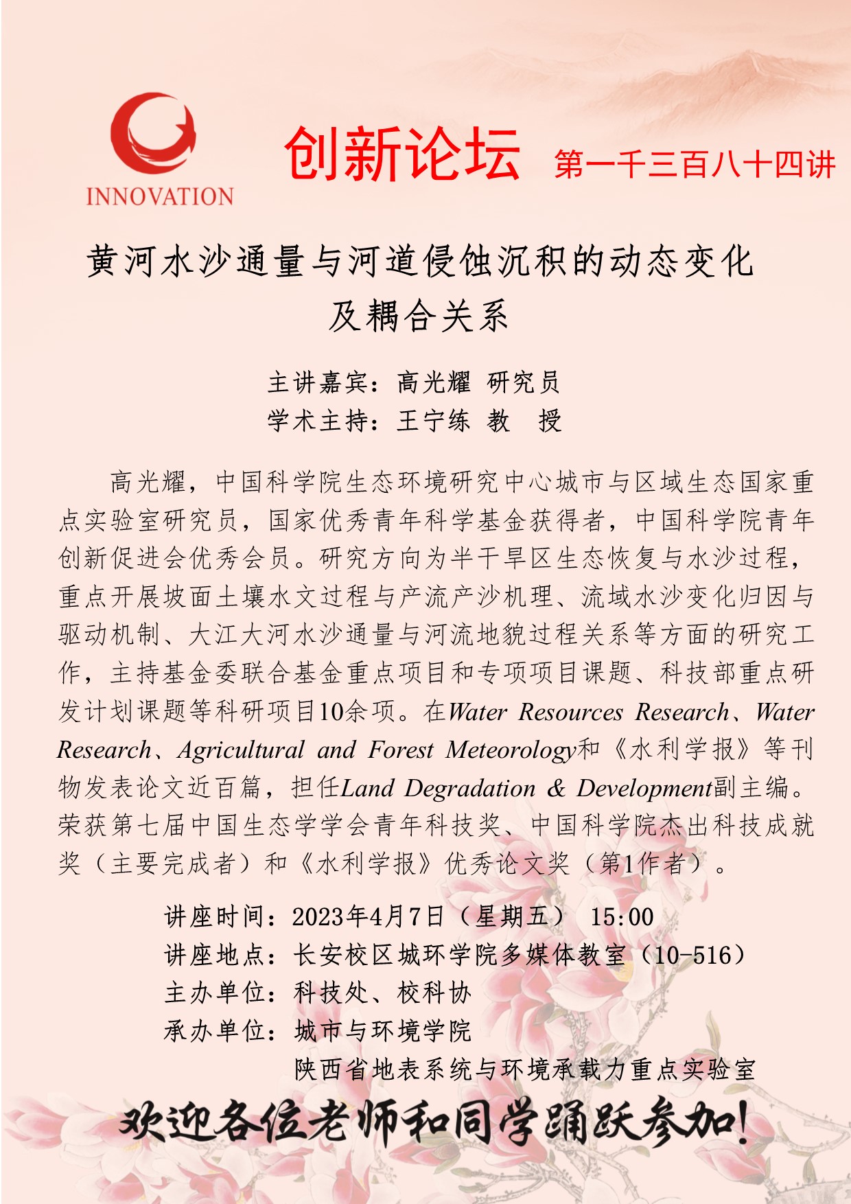 高光耀 研究员 乐投平台创新论坛第一千三百八十四讲:黄河水沙通量与河道侵蚀沉积的动态变化及耦合关系 讲座时间 2023年4月7日(星期五) 15:00 讲座地点 长安校区城环学院多媒体教室(10-516) 讲座人介绍 高光耀 研究员 讲座内容