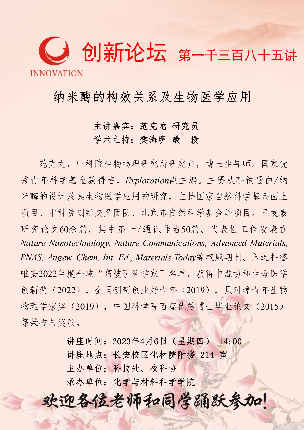 范克龙 研究员 乐投平台创新论坛第一千三百八十五讲:纳米酶的构效关系及生物医学应用 讲座时间 2023年4月6日(星期四) 14:00 讲座地点 长安校区化材院附楼 214 室 讲座人介绍 范克龙 研究员 讲座内容