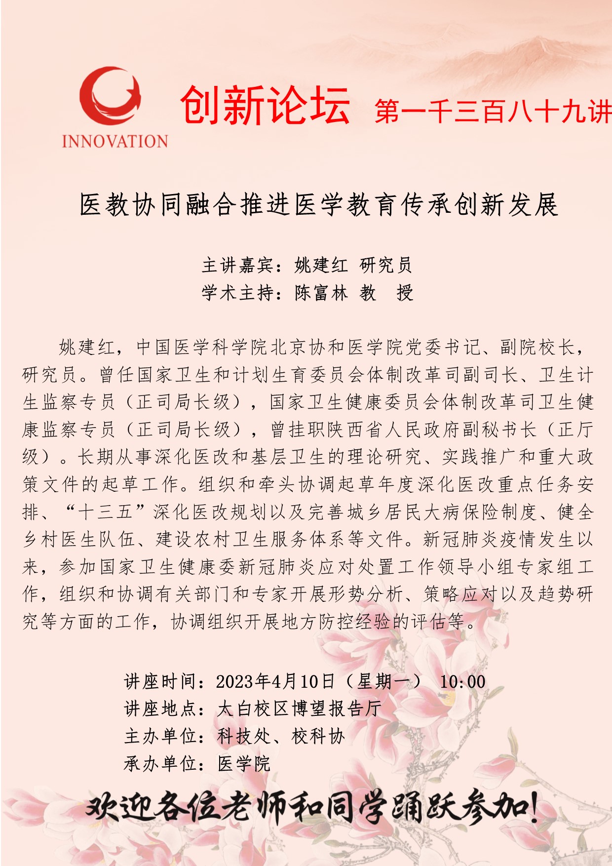 姚建红 研究员 乐投平台创新论坛第一千三百八十九讲:医教协同融合推进医学教育传承创新发展 讲座时间 2023年4月10日(星期一) 10:00 讲座地点 太白校区博望报告厅 讲座人介绍 姚建红 研究员 讲座内容