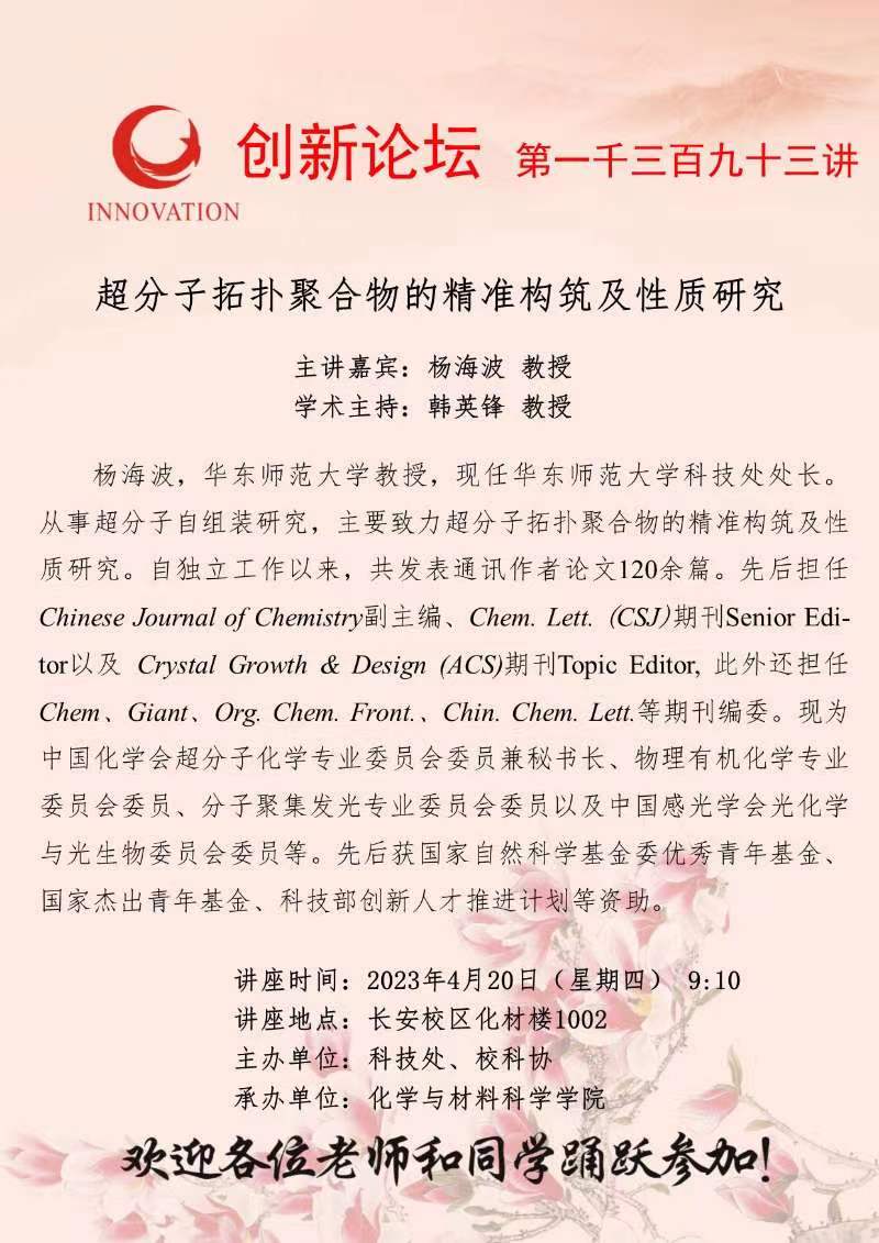 杨海波 教授 乐投平台创新论坛第一千三百九十三讲:超分子拓扑聚合物的精准构筑及性质研究 讲座时间 2023年4月20日(星期四) 9:10 讲座地点 长安校区化材楼1002 讲座人介绍 杨海波 教授 讲座内容