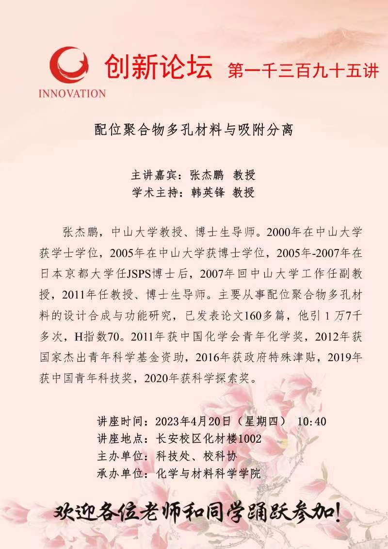 张杰鹏 教授 乐投平台创新论坛第一千三百九十五讲:配位聚合物多孔材料与吸附分离 讲座时间 2023年4月20日(星期四) 10:40 讲座地点 长安校区化材楼1002 讲座人介绍 张杰鹏 教授 讲座内容