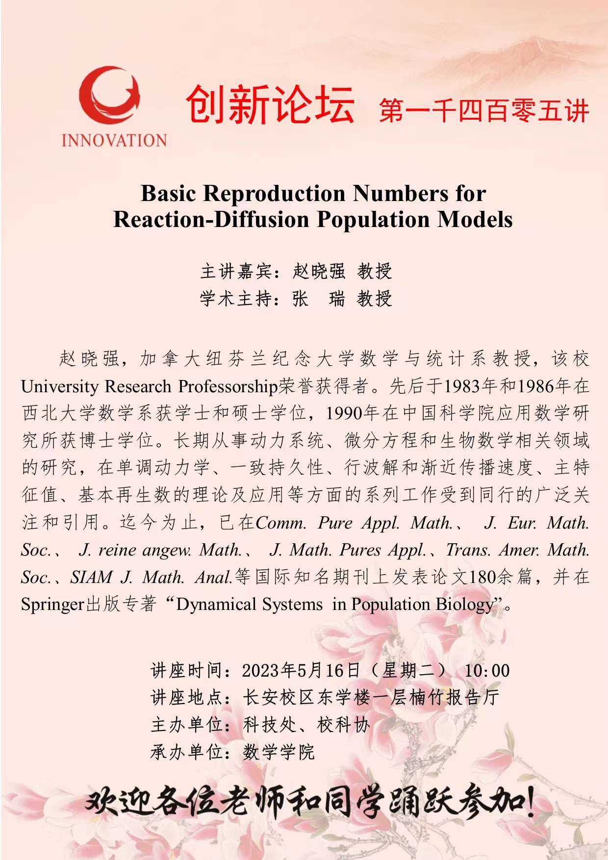 赵晓强 教授 乐投平台创新论坛第一千四百零五讲:Basic Reproduction Numbers for Reaction-Diffusion Population Models 讲座时间 2023年5月16日(星期二) 10:00 讲座地点 长安校区东学楼一层楠竹报告厅 讲座人介绍 赵晓强 教授 讲座内容