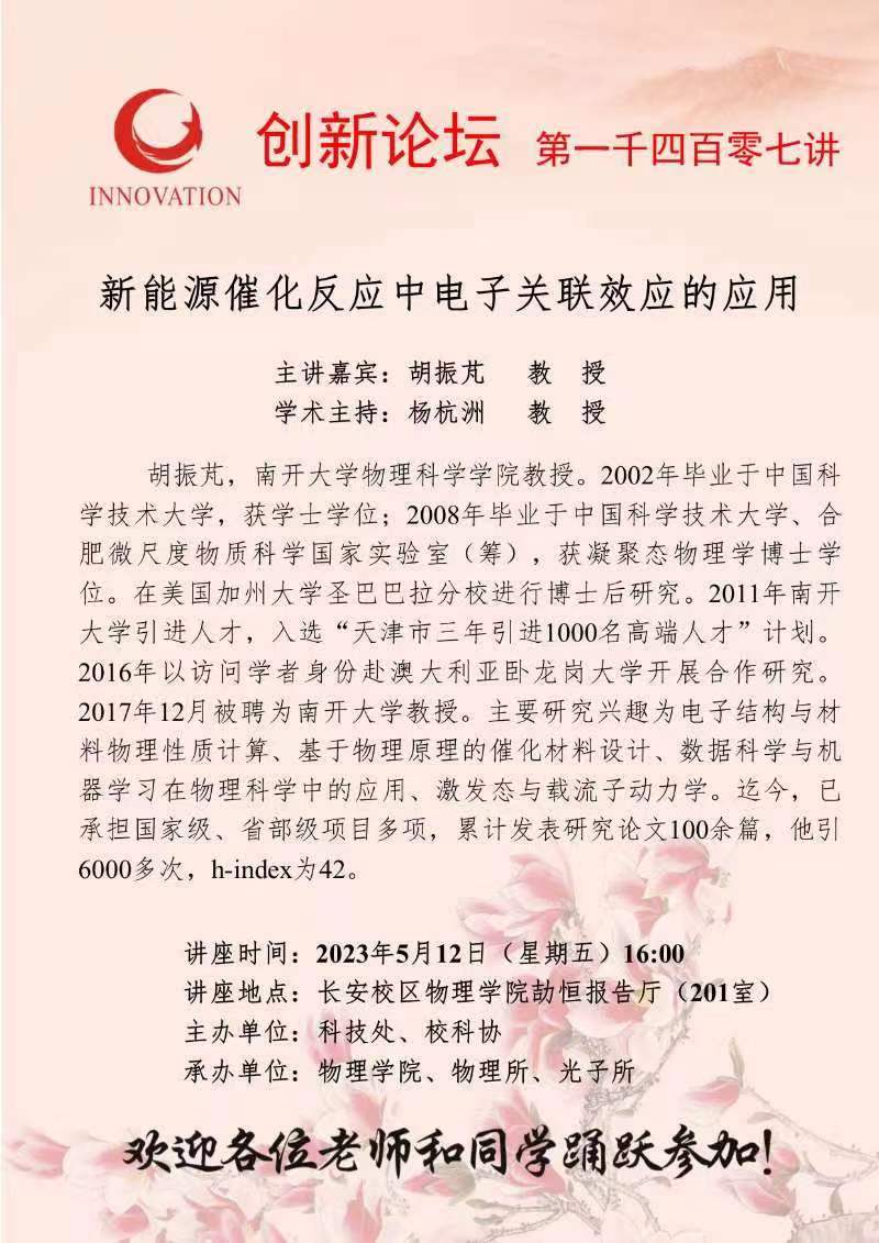 胡振芃 教 授 乐投平台创新论坛第一千四百零七讲:新能源催化反应中电子关联效应的应用 讲座时间 2023年5月12日(星期五)16:00 讲座地点 长安校区物理学院劼恒报告厅(201室) 讲座人介绍 胡振芃 教 授 讲座内容
