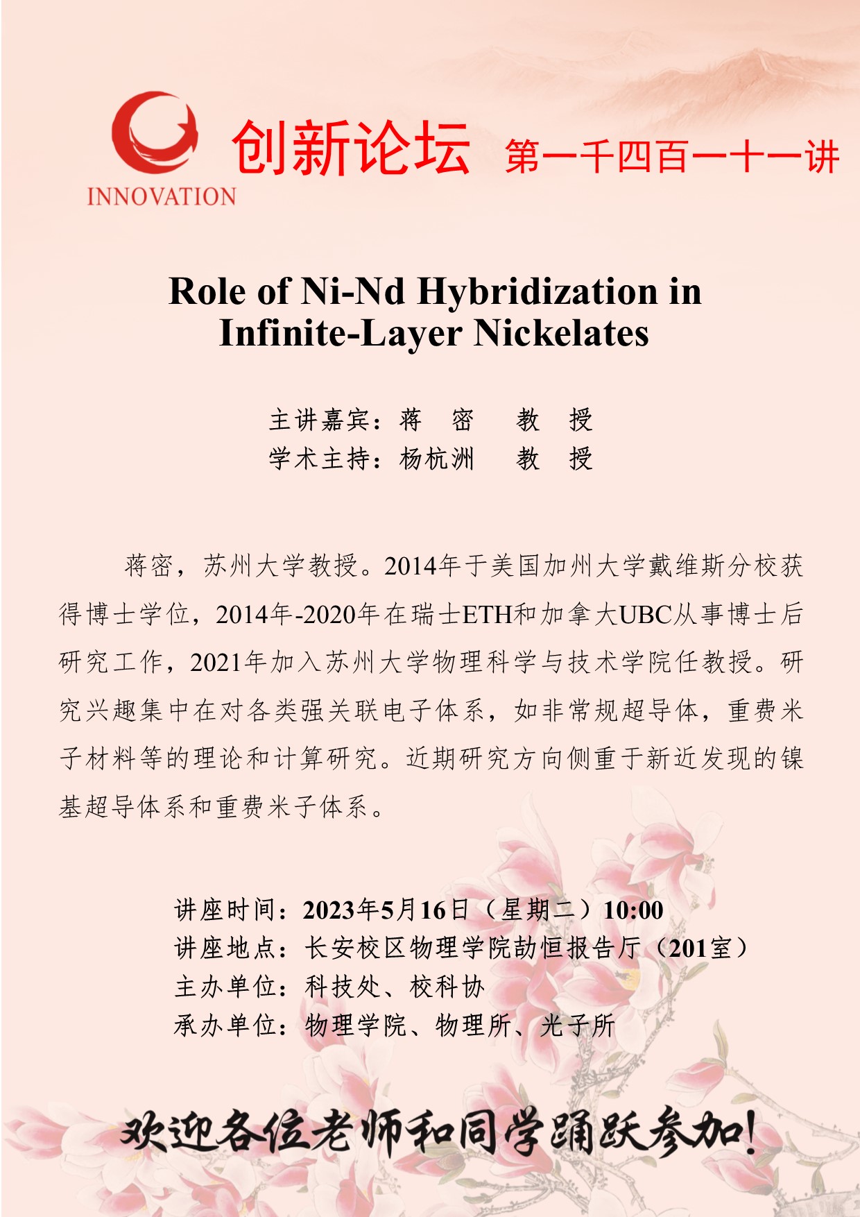 蒋密 教授 乐投平台创新论坛第一千四百一十一讲:Role of Ni-Nd Hybridization in Infinite-Layer Nickelates 讲座时间 2023年5月16日(星期二)10:00 讲座地点 长安校区物理学院劼恒报告厅(201室) 讲座人介绍 蒋密 教授 讲座内容