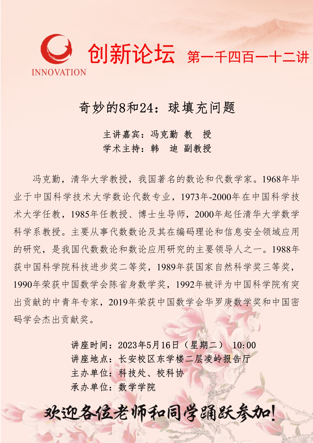 冯克勤 教授 乐投平台创新论坛第一千四百一十二讲:奇妙的8和24:球填充问题 讲座时间 2023年5月16日(星期二)10:00 讲座地点 长安校区东学楼二层凌岭报告厅 讲座人介绍 冯克勤 教授 讲座内容